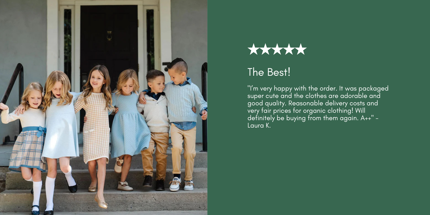 "I’m very happy with the order. It was packaged super cute and the clothes are adorable and good quality. Reasonable delivery costs and very fair prices for organic clothing! Will definitely be buying from them again. A++" - Laura K.