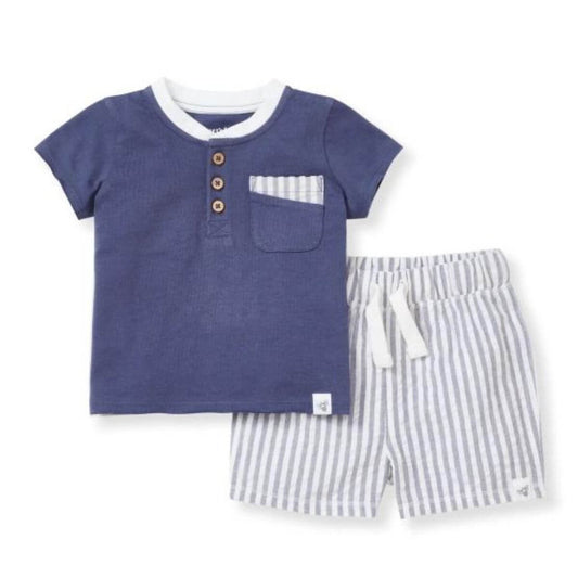 Organic Baby Boy Outfit / Henley Tee & Short Set - Seersucker
