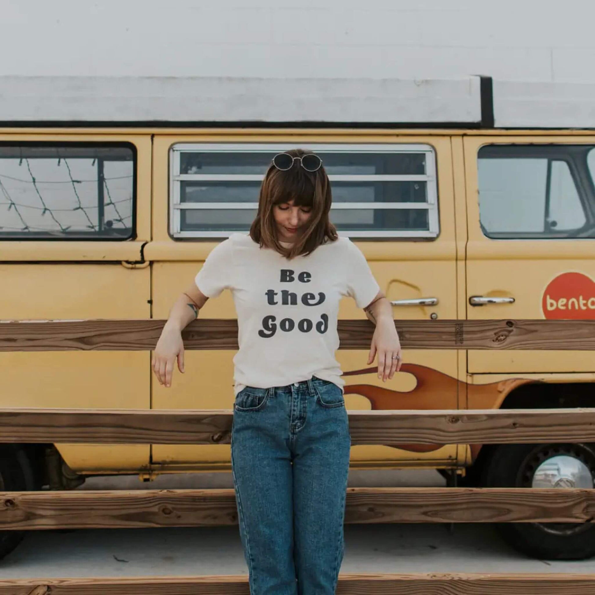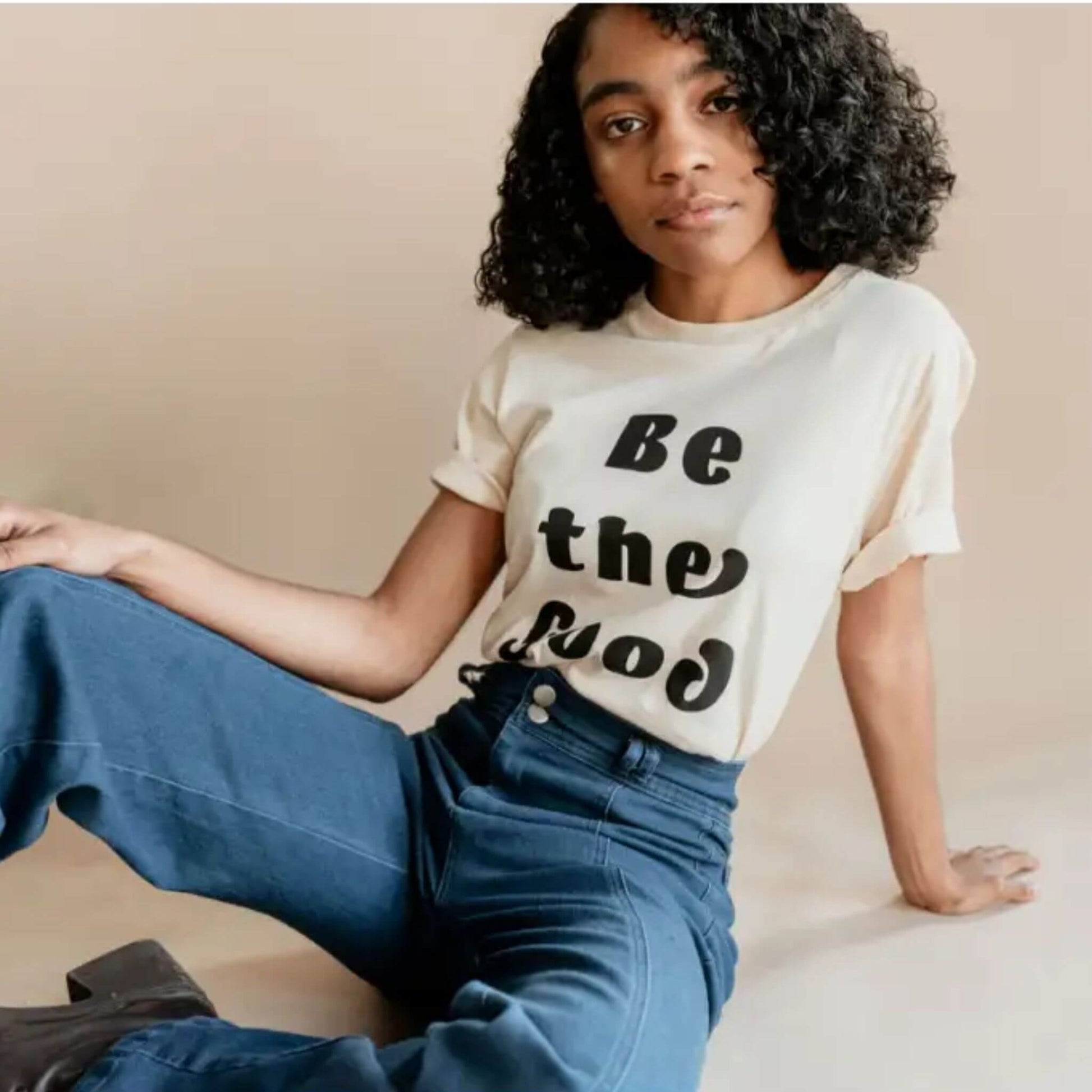 This organic adult crew neck t-shirt encourages others to be their absolute best selves. With white and black organic cotton fabric, the tee is made to inspire with the slogan, "Be the Good."