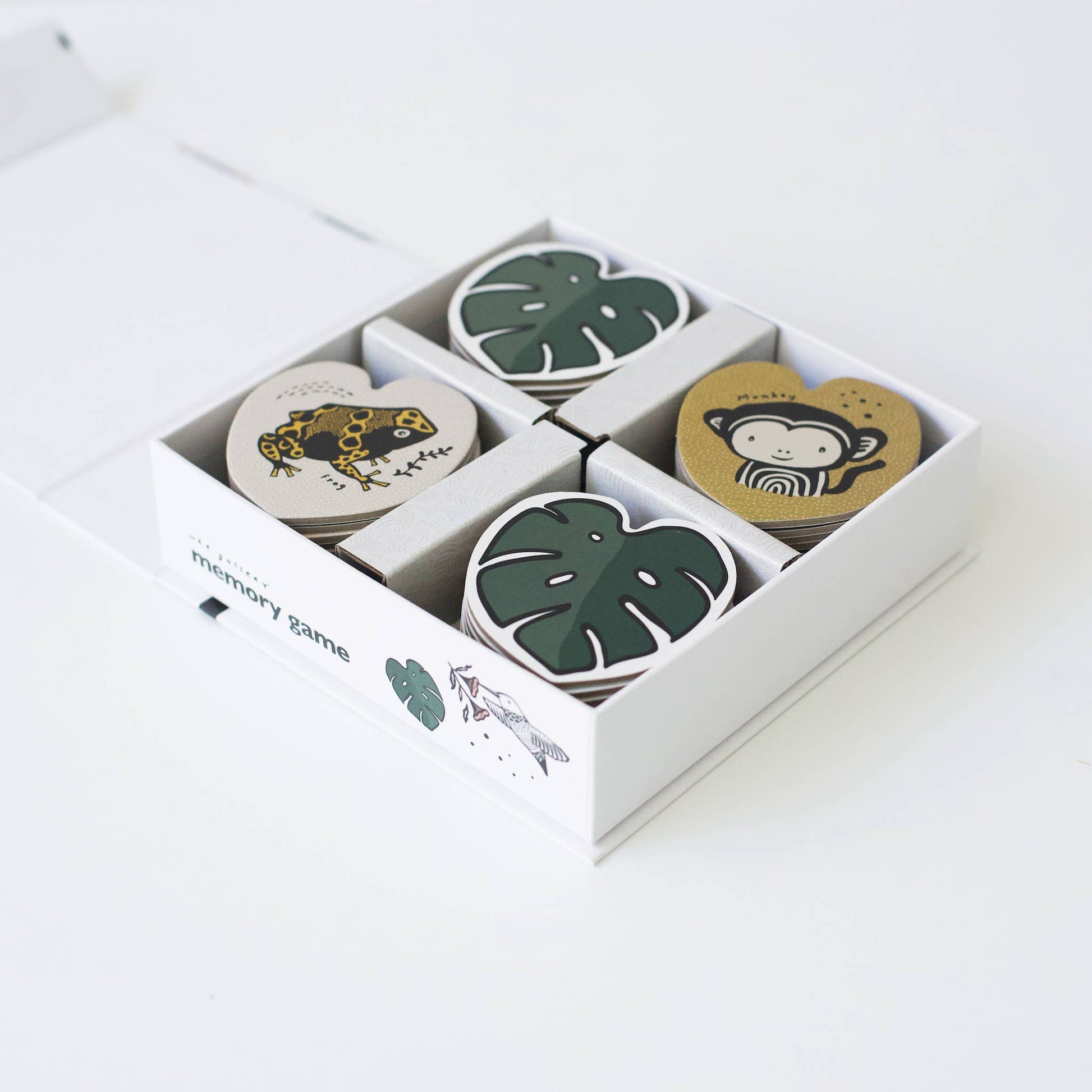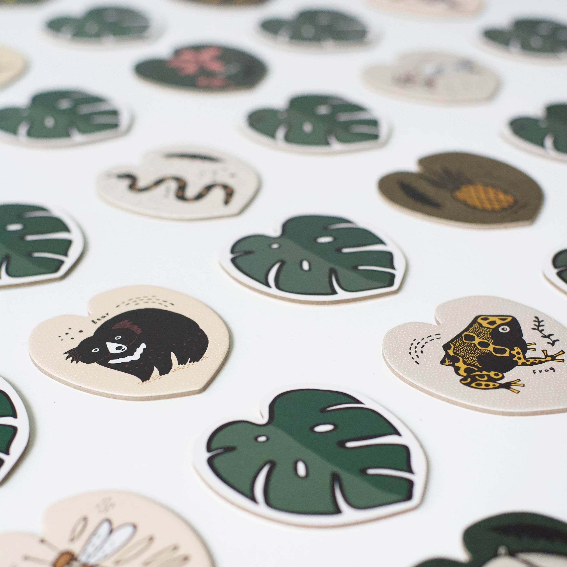 For parents looking to encourage cognitive skills while having fun — this Memory Game is a match! These adorable leaf shaped cards are perfect for play and just the right size for little hands. Kids will be entertained by the animal and plant illustrations, designed to encourage conversation and imagination. You will find monkey, lemur, frog, iguana, and more in this illustrated Jungle themed set. The cards are made of sturdy FSC certified board, and the box has a magnet closure for easy storage.