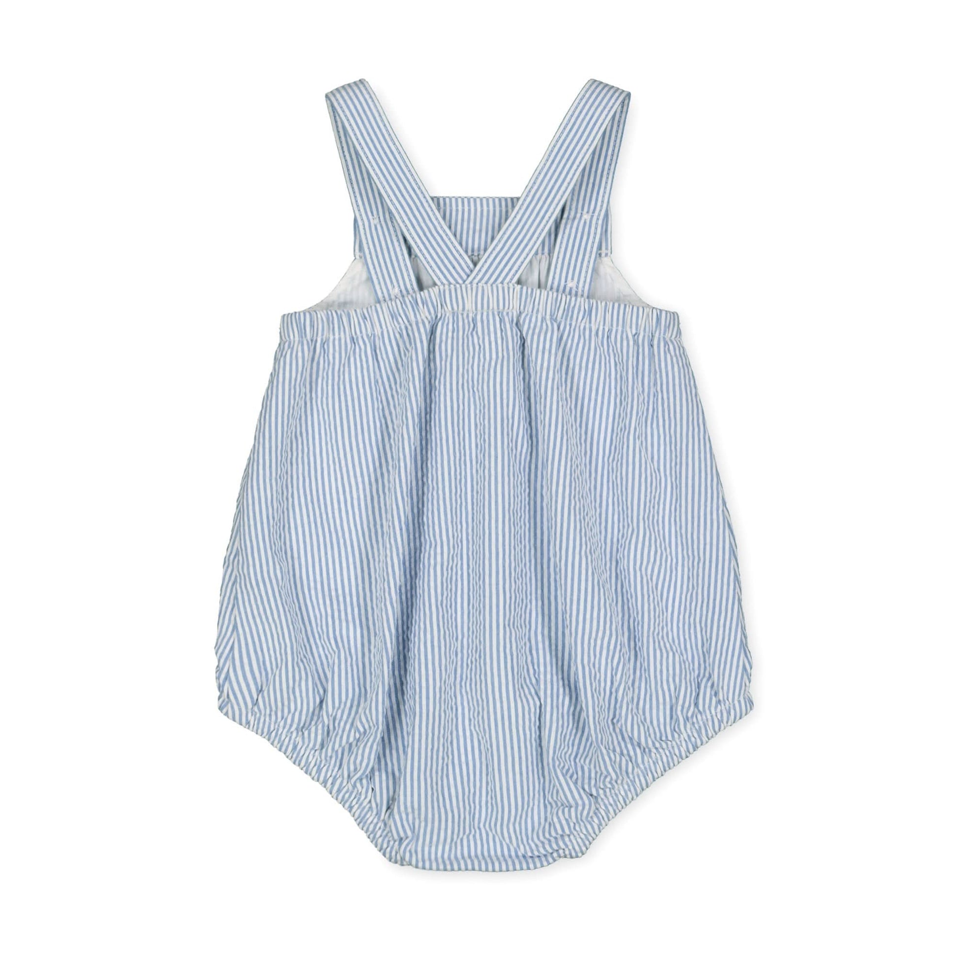 This unisex baby bubble romper will make the sweetest statement on your little one. Cut in breezy organic cotton seersucker, this romper features a cute bubble silhouette, straps with adjustable button closures, elasticated leg openings, and gusset snaps to make diaper changes a fuss-free affair. Fully lined in 100% organic cotton and ready for picture perfect moments.