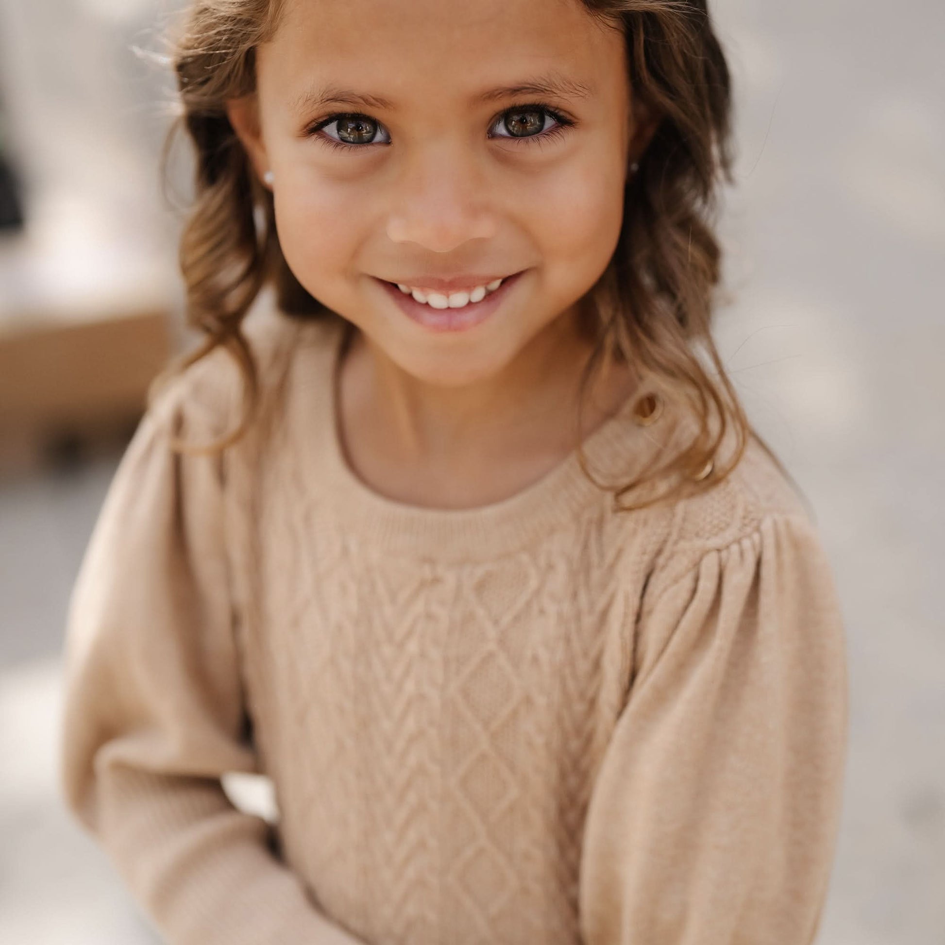 This perfectly put-together dressy baby girl sweater dress in soft organic cotton. Features beautiful leg of mutton sleeves, cable knit on the front and back bodice, a small waist bow, and gold buttons at the shoulder placket for easy dressing. An absolutely darling look she's sure to love.
