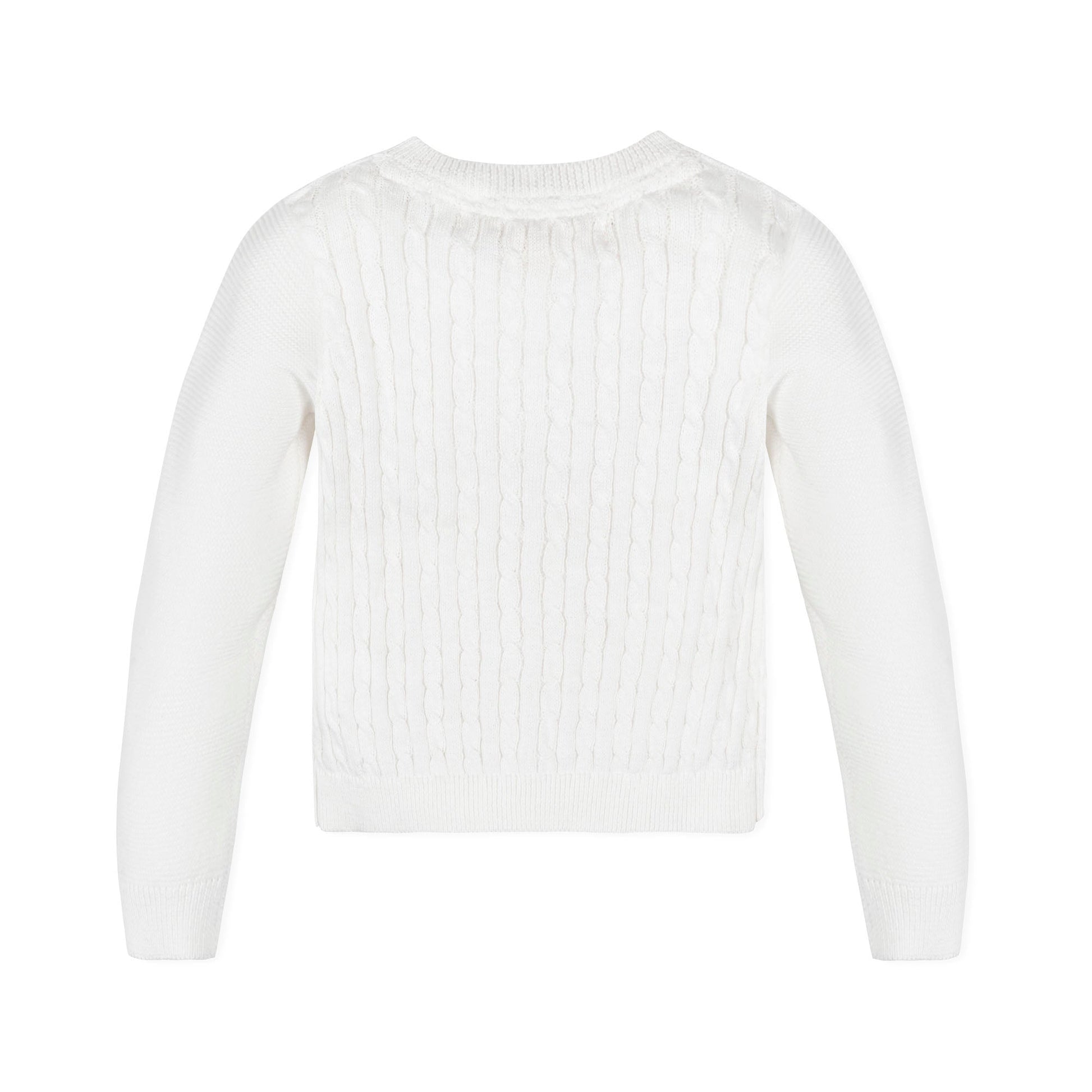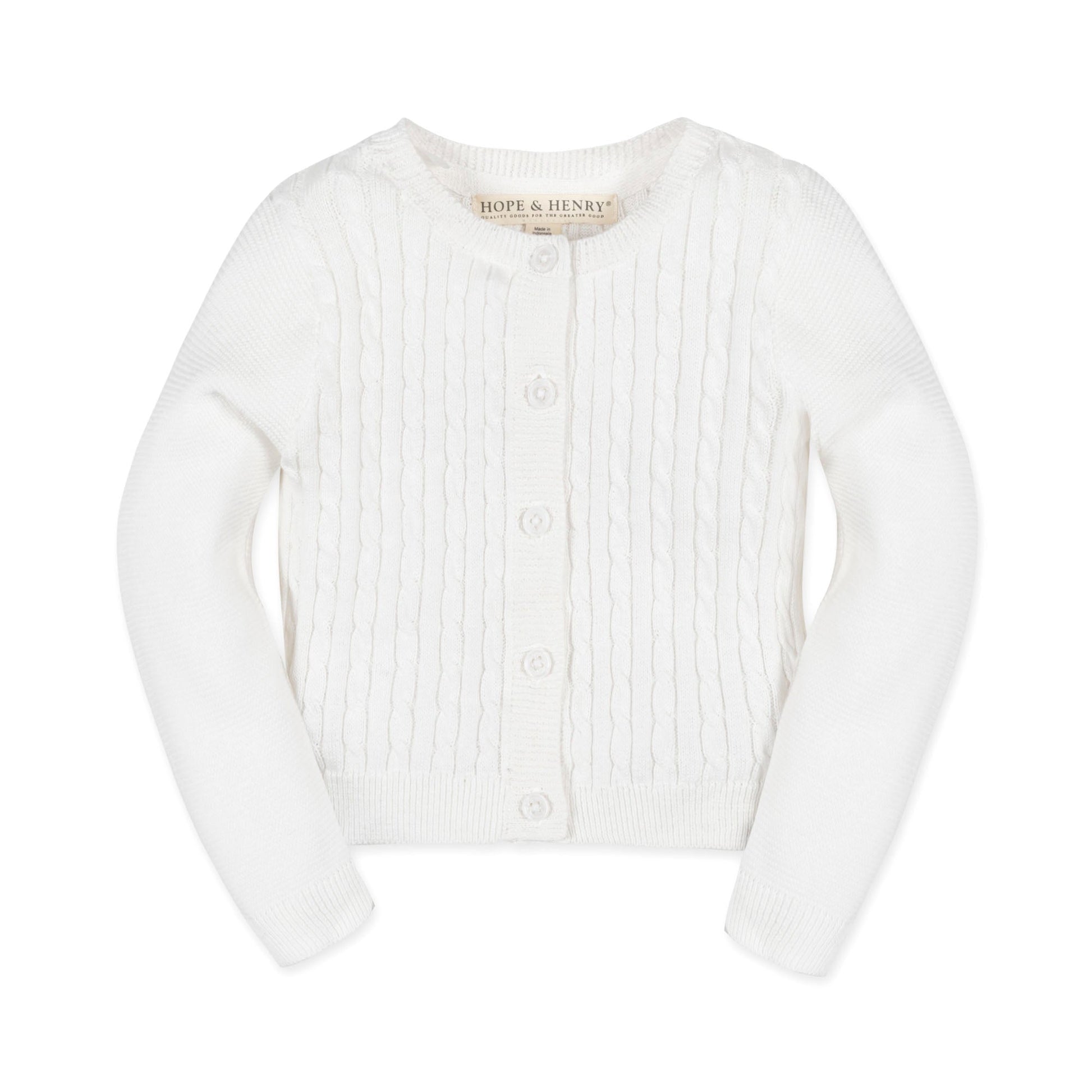 Keep your little one cozy with our classic cable knit cardigan sweater in soft organic cotton. Features classic styling with pearlized buttons down the center front, delicate cable knit on the front and back bodice, and a purl stitch at the sleeves. An all-purpose layering piece for baby that can be both casual or dressy for special occasions.