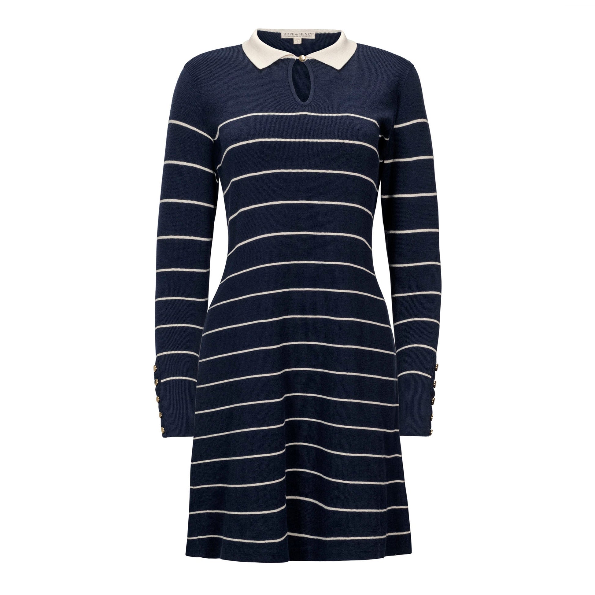 The epitome of effortless chic. This sophisticated women's sweater dress in soft organic cotton exudes timeless charm. Features a sweater knit contrast collar, gold button details at the cuffs and center front keyhole closure, and an easy to wear silhouette.