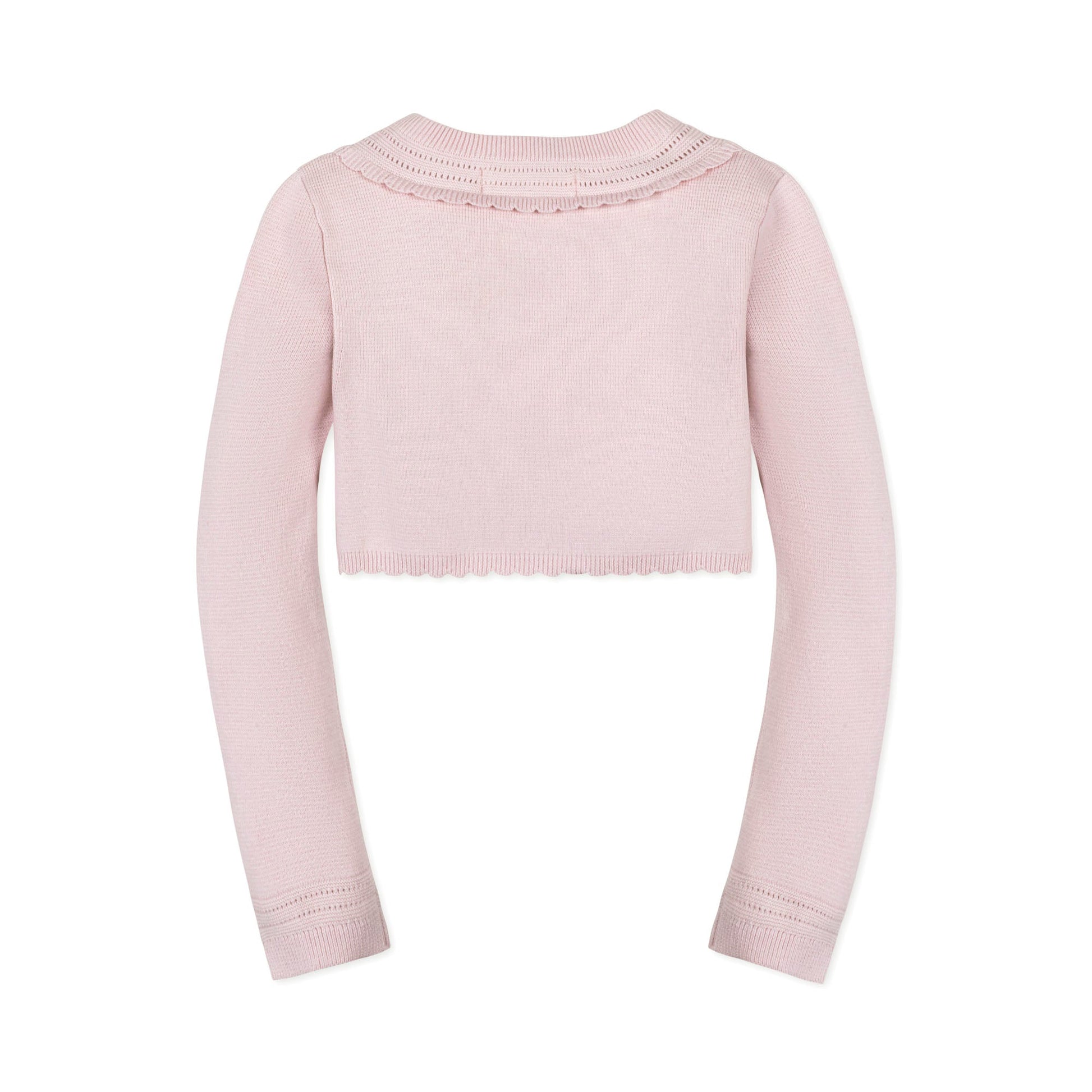 A beautiful layer to top off her dressy outfits. This cropped cardigan baby girl sweater is knit in fine gauge organic cotton with full fashioning at armholes and a pointelle pattern throughout. Features delicate pearlized buttons.