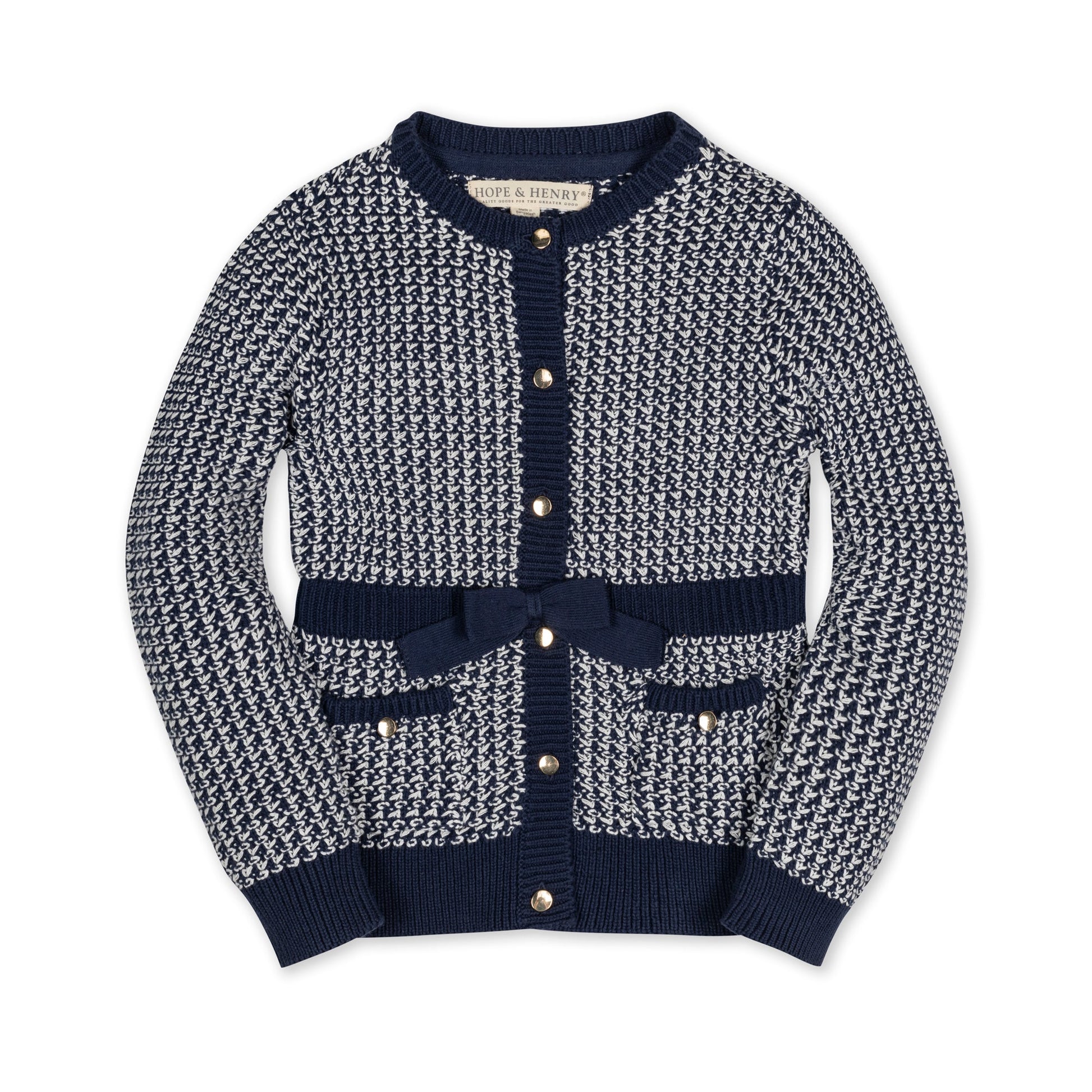 This sophisticated baby girl sweater cardigan in soft organic cotton is elevated by a beautiful tweed-like stitch. Features gold buttons, front patch pockets, contrast trim, and a sweet bow detail at the waist. This piece pairs perfectly with knit tops and skirts for a polished look.