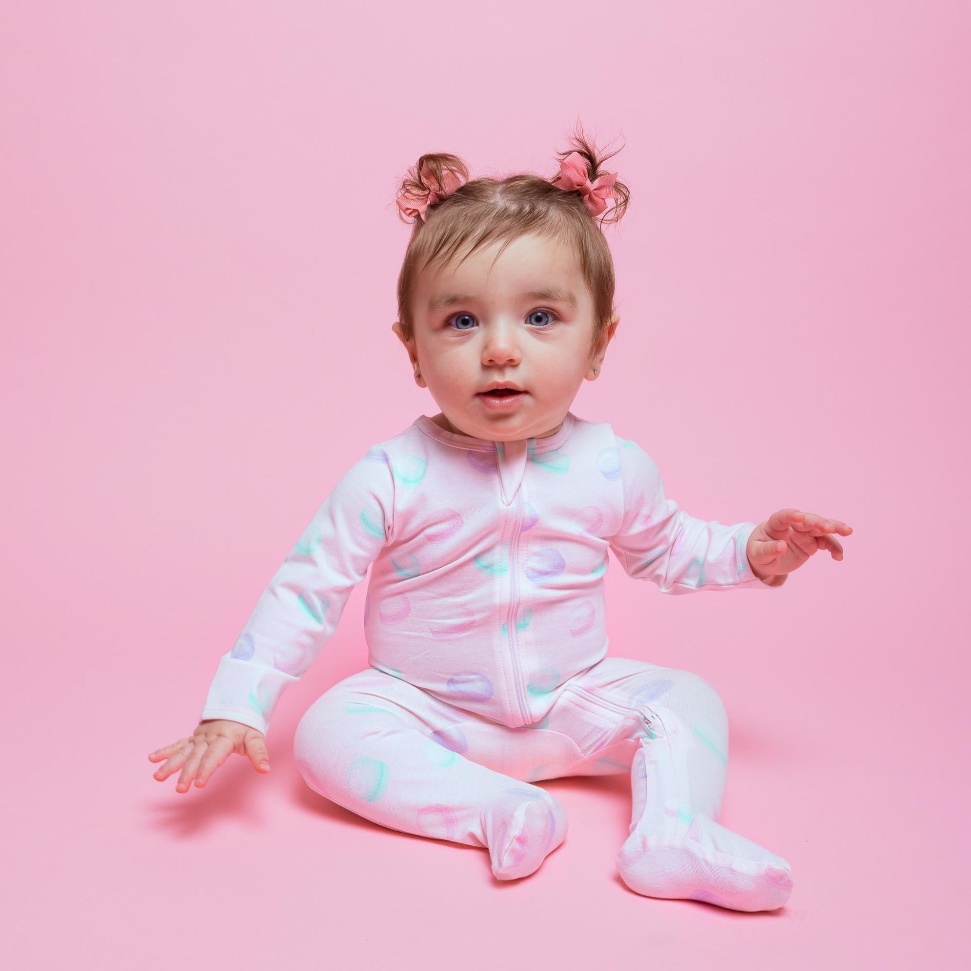 This cute and comfy organic footed baby sleeper features a sweet macaron print. With a two-way zipper for easy diaper changes and a relaxed hand opening.