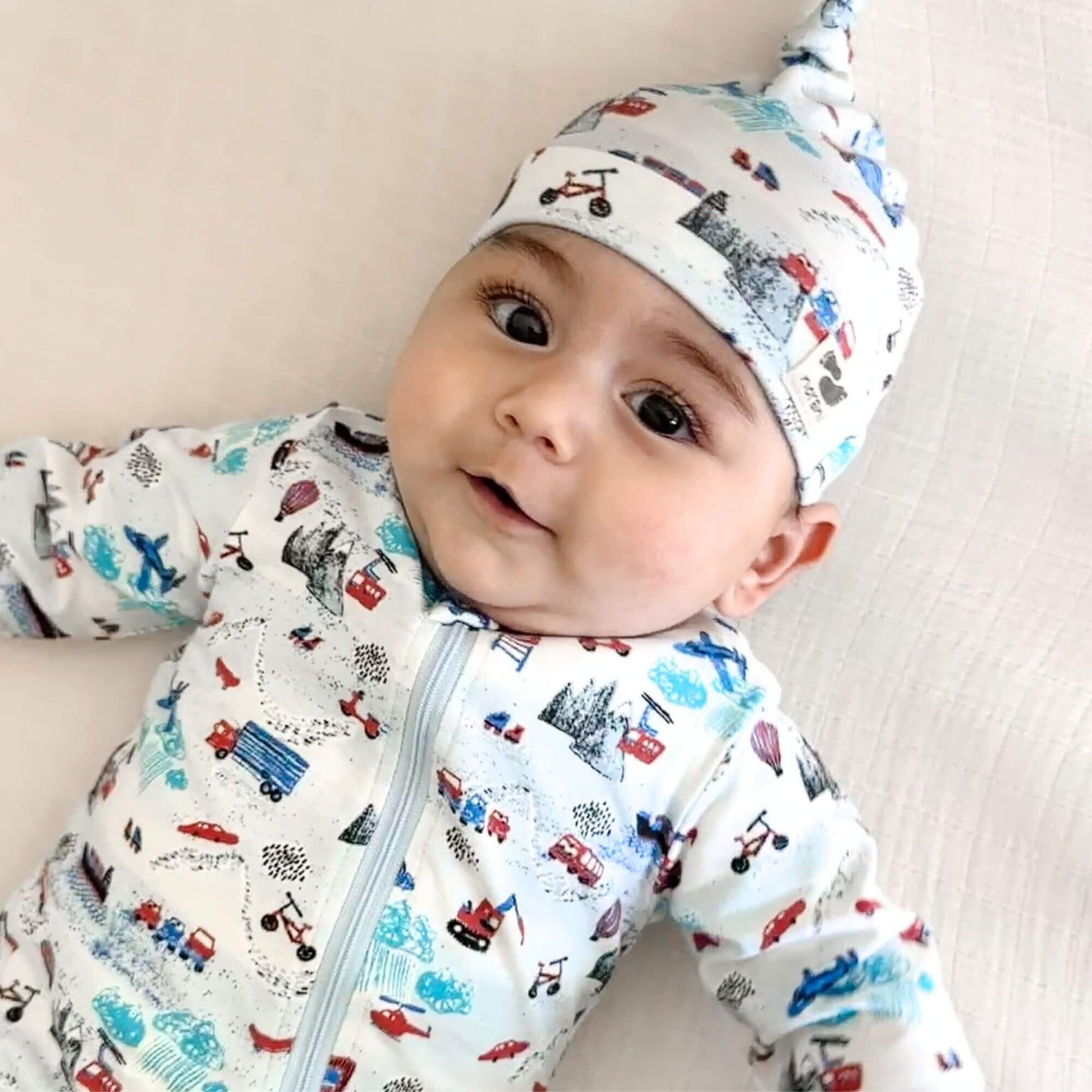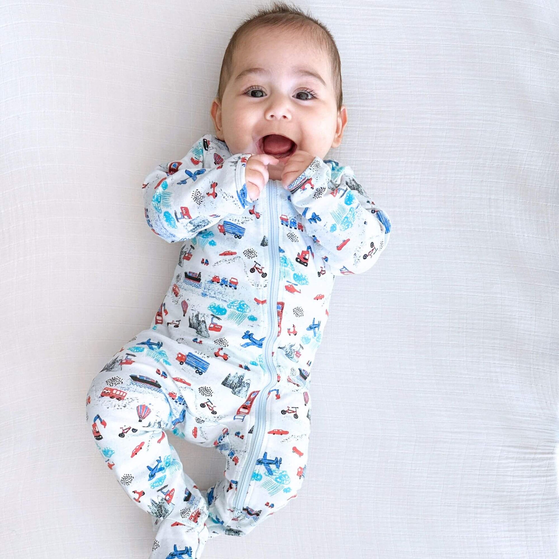 This cute and comfy organic footed baby sleeper features cars, trucks, airplanes, helicopters and more. With a two-way zipper for easy diaper changes and a relaxed hand opening.