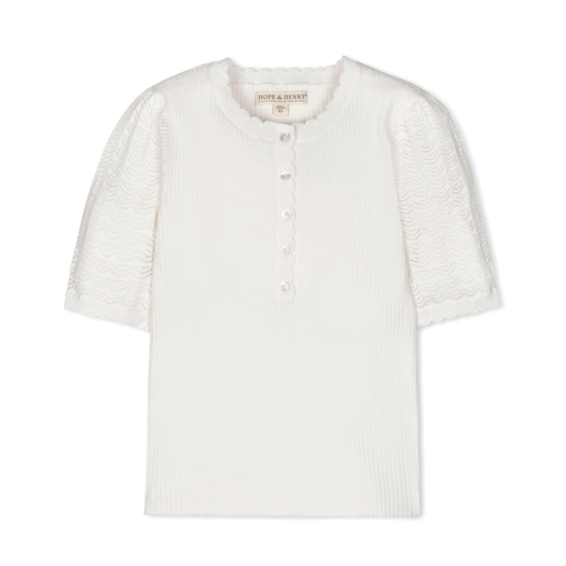 Keep it simple yet chic in this women's puff sleeve henley sweater crafted from soft organic cotton. Features a henley button placket, scallop edge trim, and a rib knit bodice paired with delicate pointelle knit puff sleeves. Works just as well for the office as it does for date night or weekend brunch.