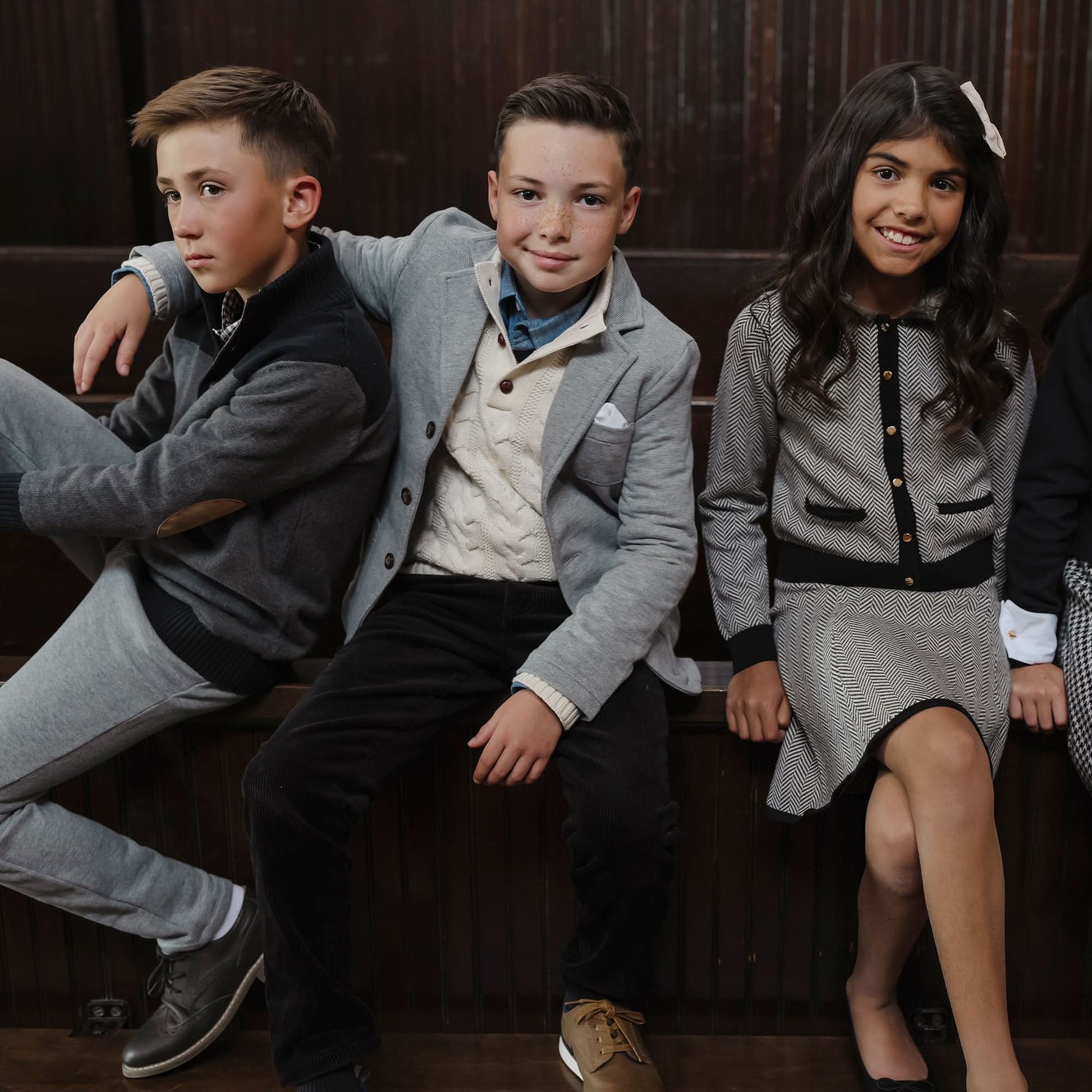 Luxuriously plush cables in organic cotton yarns make this boys ivory sweater a must have for cooler months. Features a rib knit mock neck with faux leather button closures at the center front placket. Fully adorned with a classic cable knit.