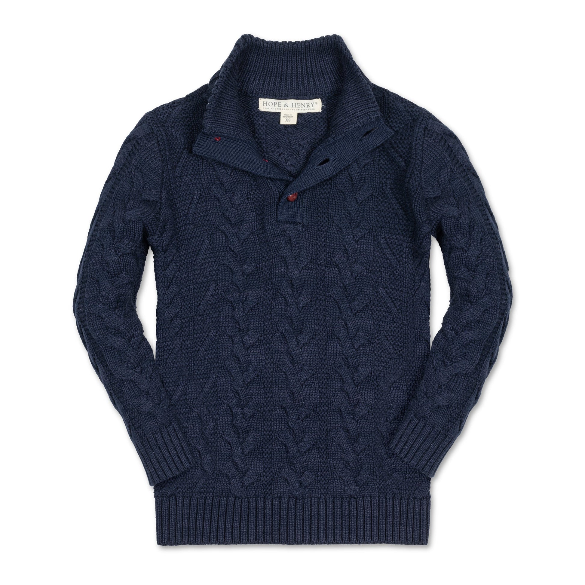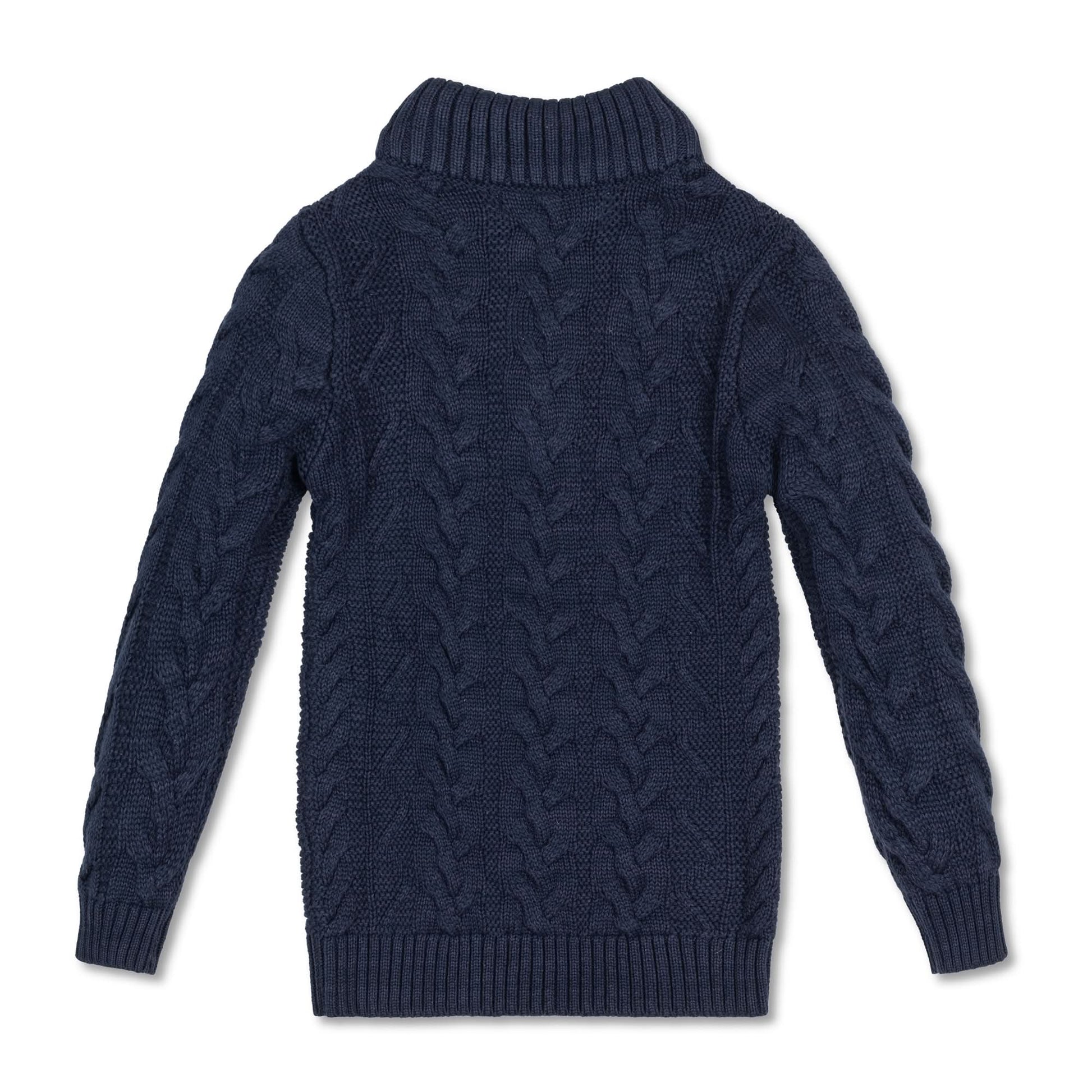 Luxuriously plush cables in organic cotton yarns make this boys navy sweater a must have for cooler months. Features a rib knit mock neck with faux leather button closures at the center front placket. Fully adorned with a classic cable knit.