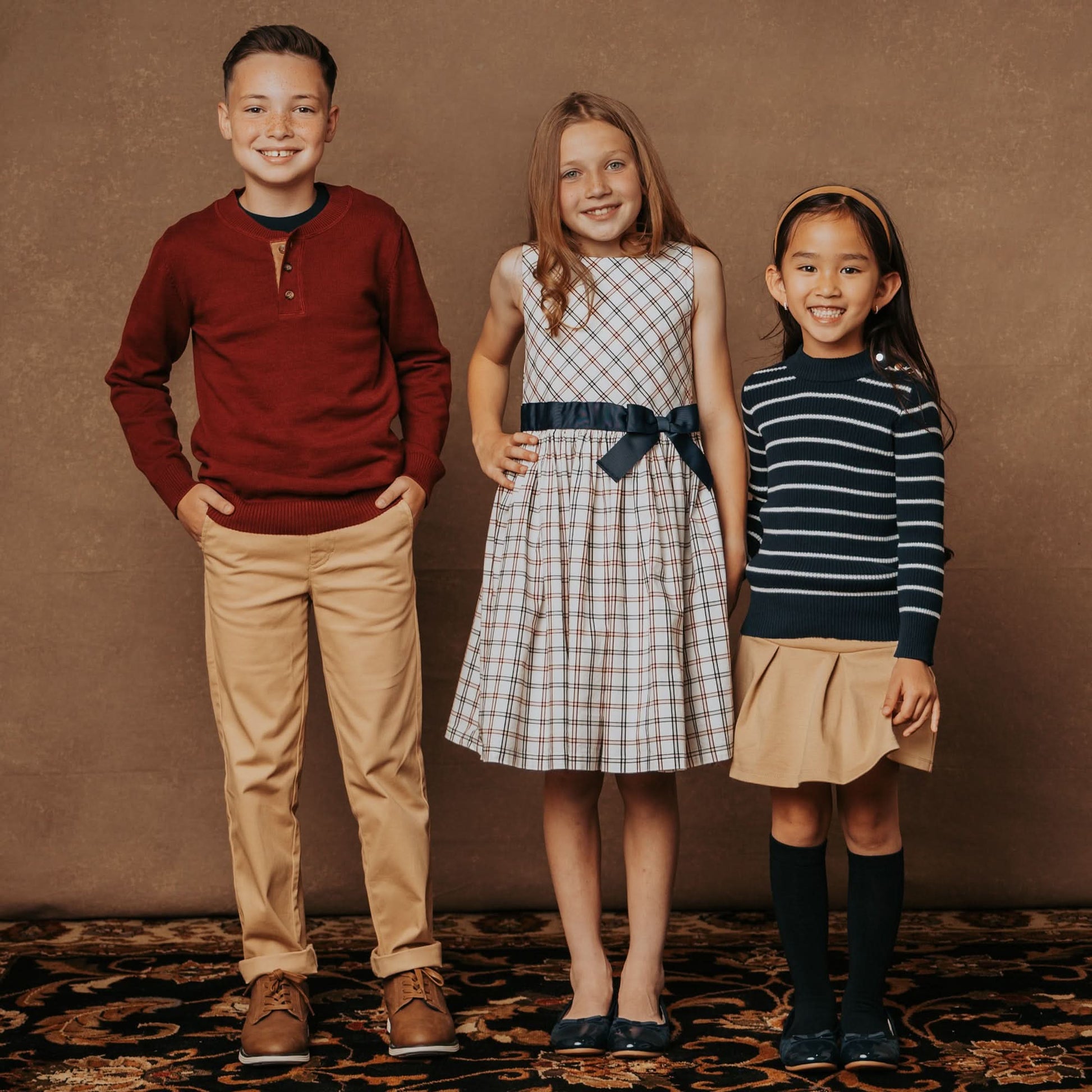 This refined long sleeve mock neck girls sweater in soft organic cotton has the sophisticated style she needs this fall and winter season. Features a navy striped pattern, gold button detail, and rib knit trim. Looks perfectly chic paired with skirts, jumpers, and leggings.