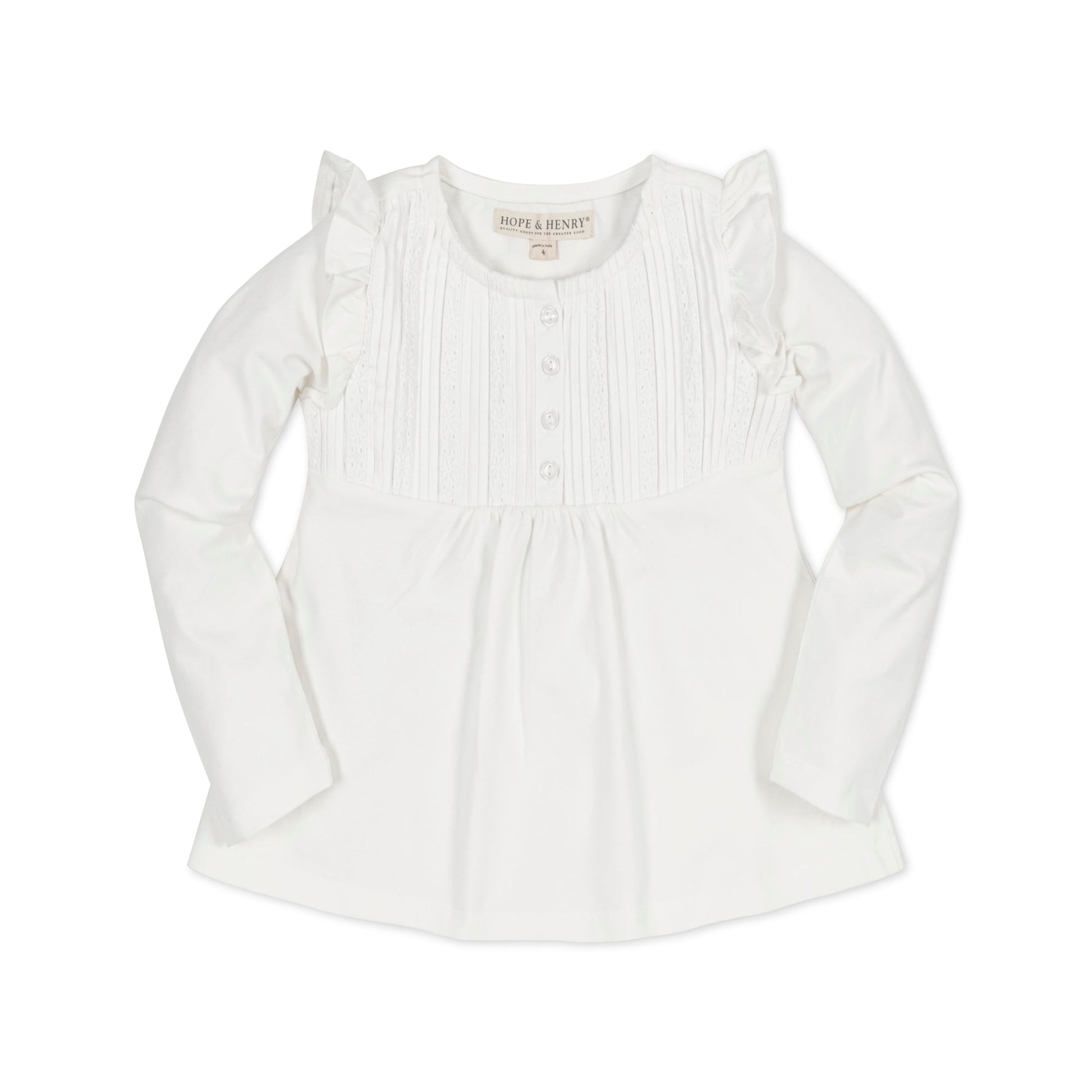 This wear-with-anything baby girl knit top is the stylish essential she won't want to take off. Crafted from a soft and stretchy organic cotton jersey blend, this top features flutter details at the shoulders, pintucking at the yoke, and a button front placket. Beautiful layered with skirts and leggings.