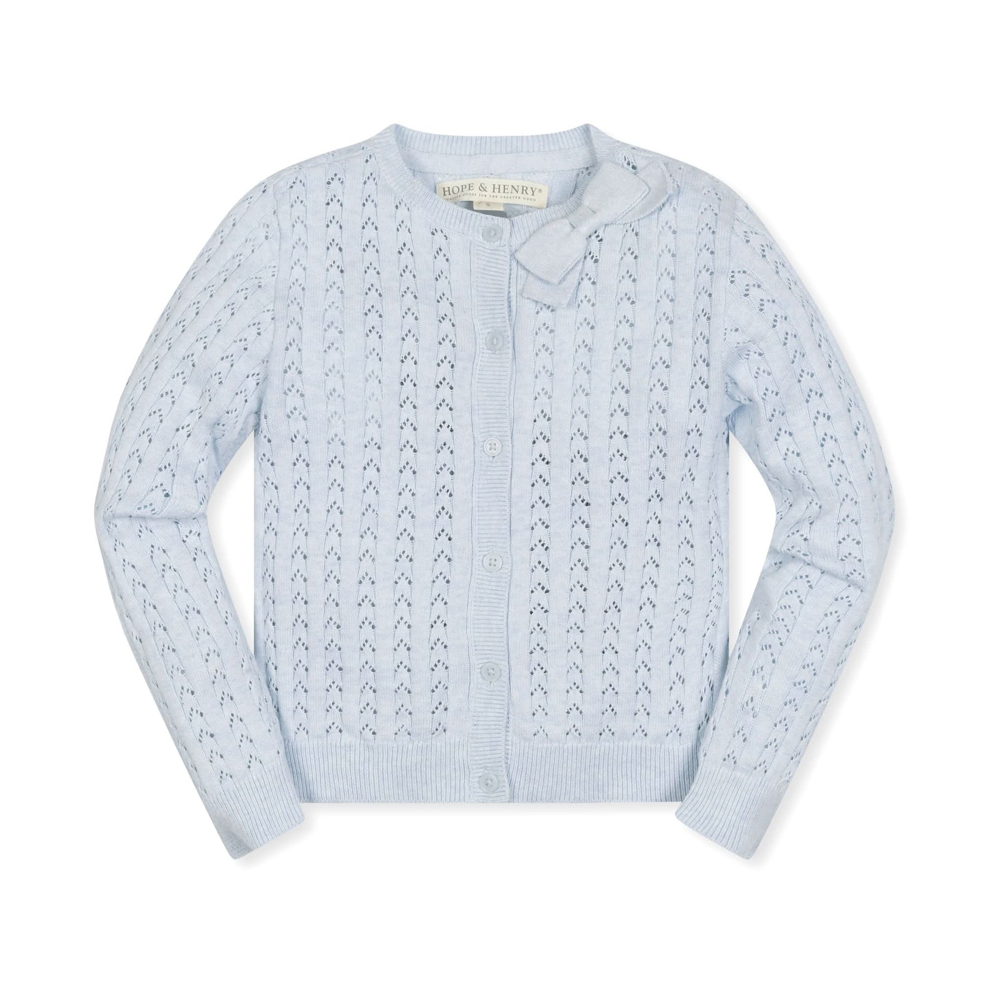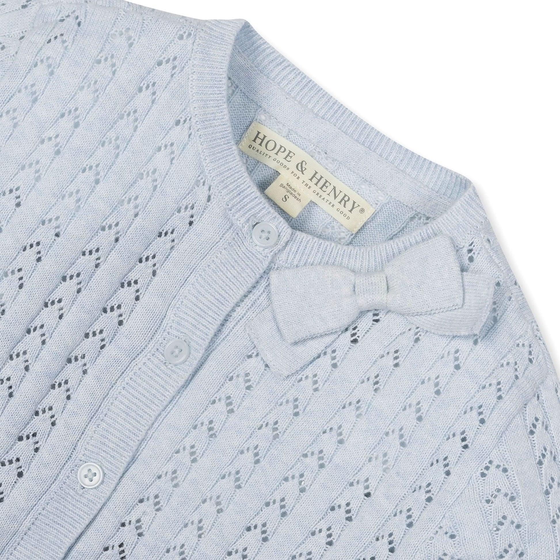 A classic baby girl cardigan silhouette in soft organic cotton feels oh-so-special thanks to a combo of sweet pointelle knit and a bow detail at the collar. Features a button front closure. A beautiful layering piece for all of spring and summer's special occasions.