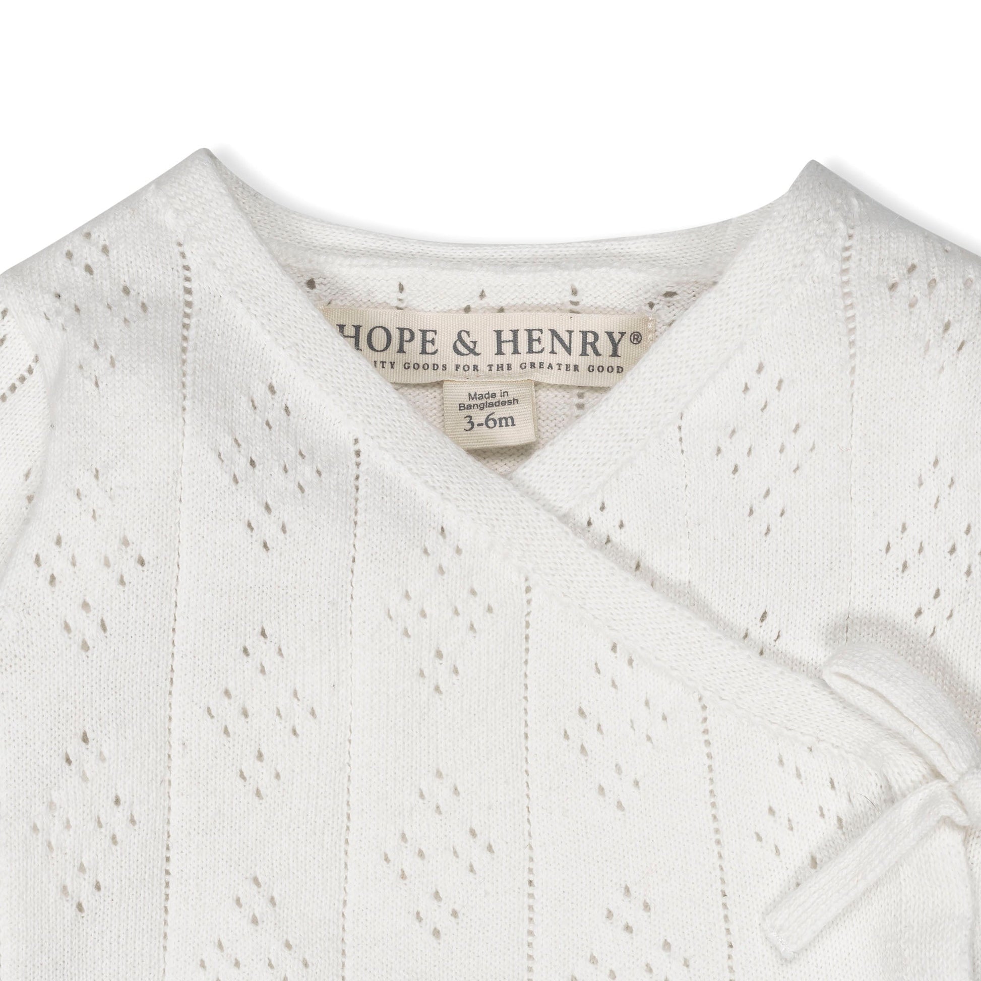 This sweet matching baby sweater set in soft organic cotton features a long sleeve kimono wrap top and a cozy footed legging to keep baby warm. A delicate pointelle stitch adorns the top which has small tie closures at the sides. The perfect baby shower gift or heirloom piece for your family.