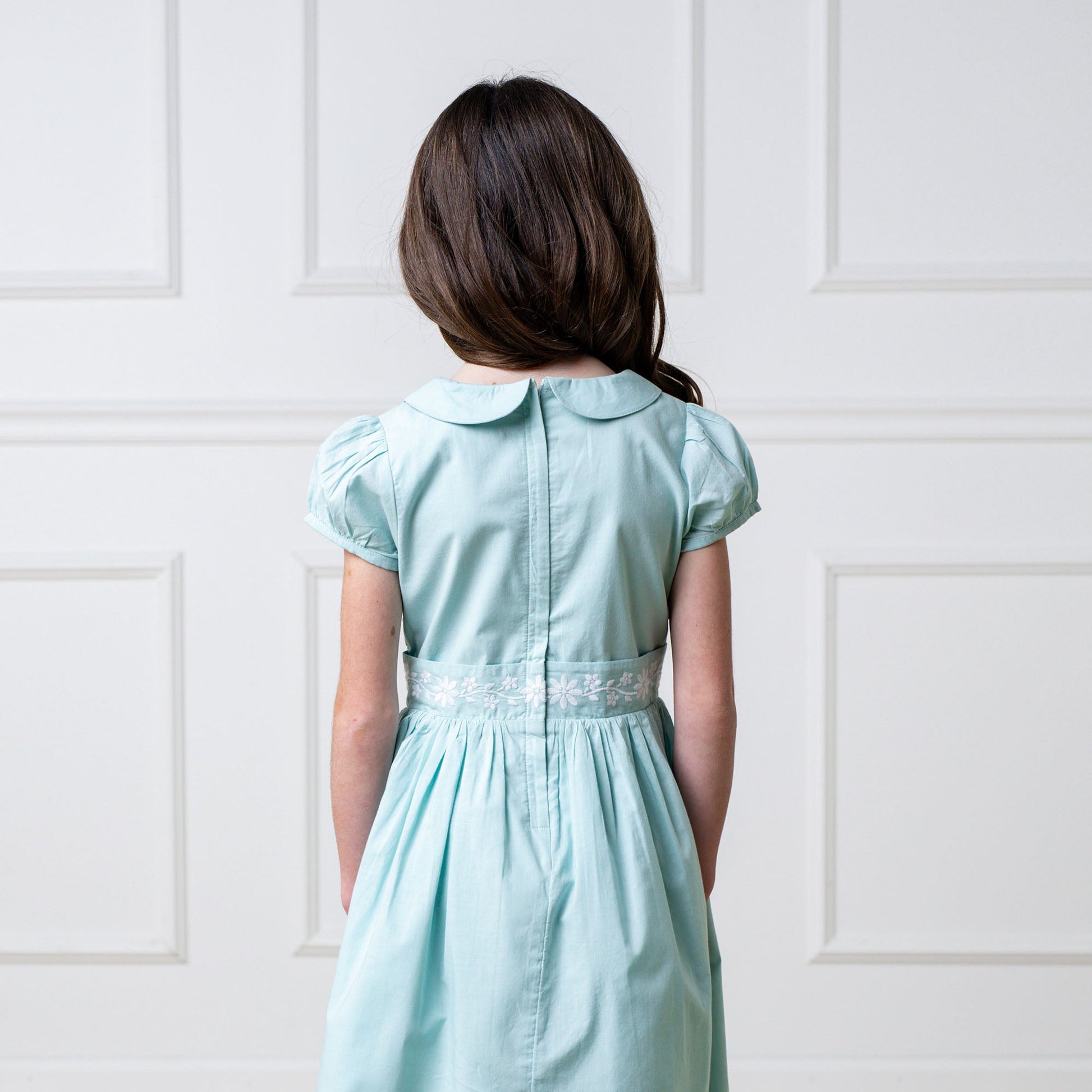 This beautiful girls dress in soft organic cotton features an adorable peter pan collar to frame her face with simple charm. Features a stretchy smocked bodice, woven collar, puff sleeves, and a waist sash with decorative embroidery. Fully lined in cotton with a zipper at the center back. Ready to shine at all of her special occasions.