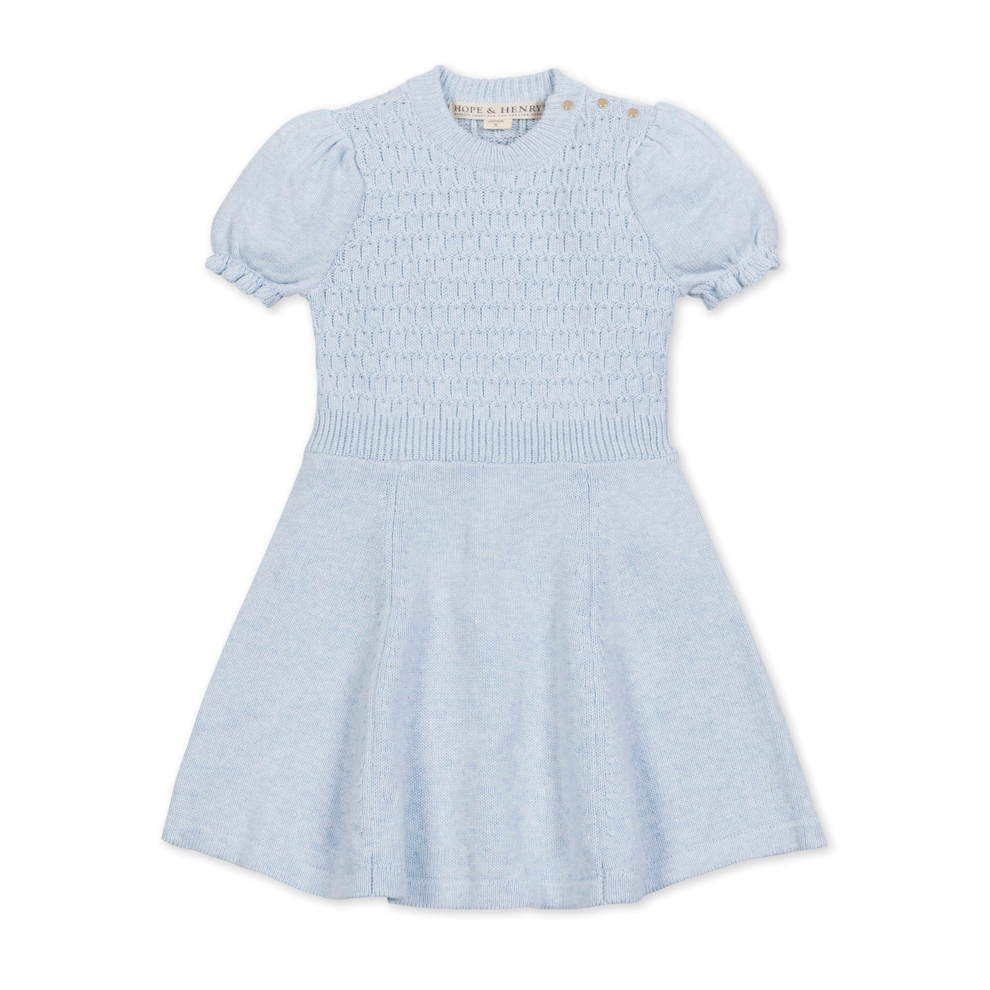The sweetest girls sweater dress for fall is here, in a soft organic cotton style that she'll be wanting to wear time and time again. Features feminine puff sleeves with ruffle edges, a mock neck with gold button details, and a flared skirt that was made for twirling. A delicate stitch on the bodice is the finishing touch.