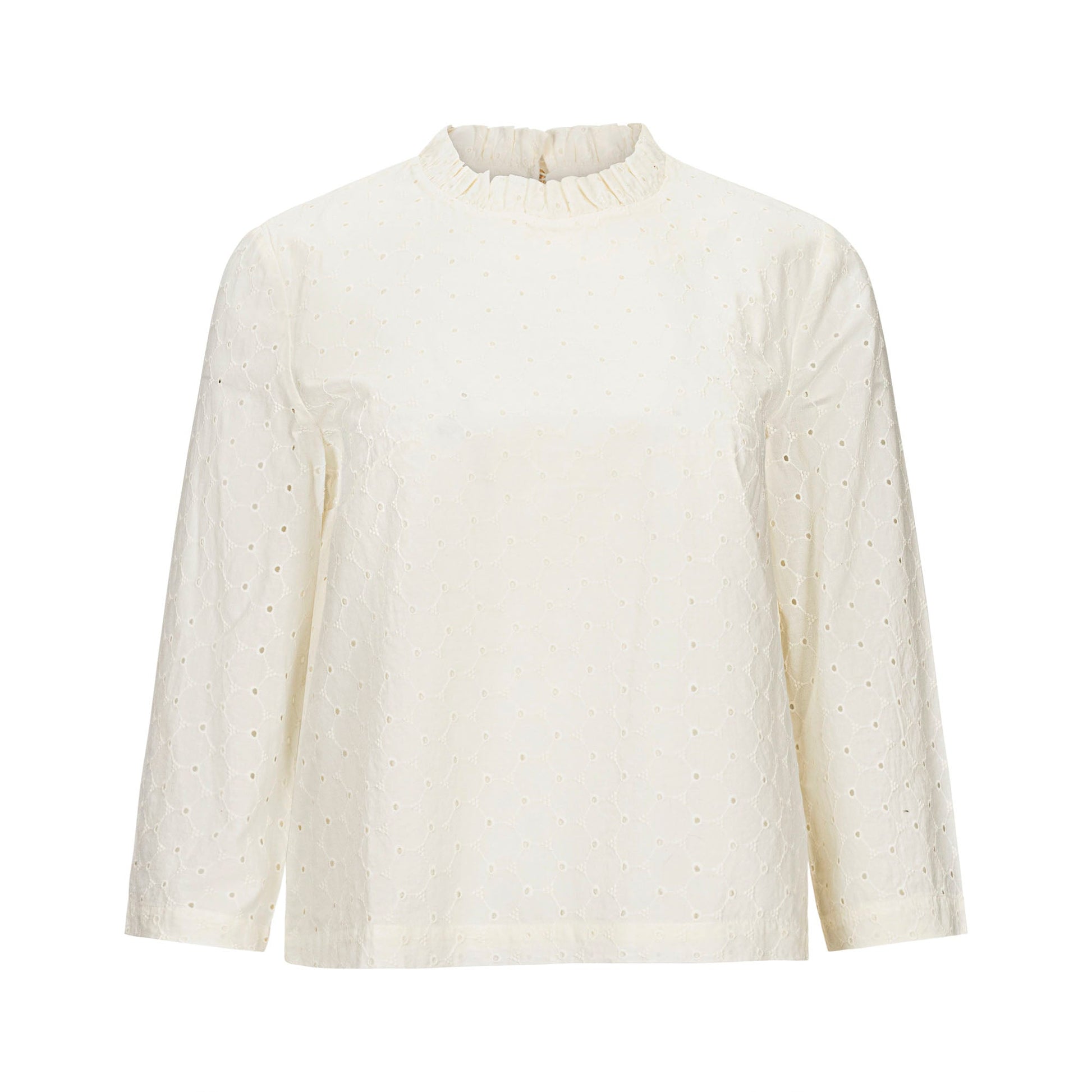 This women's ruffle collar eyelet top is the perfect example of how we like to make everyday feel special. Just as perfect dressed up under a blazer as it is with jeans, this shirt has a comfortable fit and just the right length. Features special details like the keyhole closure at the back neck and a beautiful organic cotton eyelet fabric.