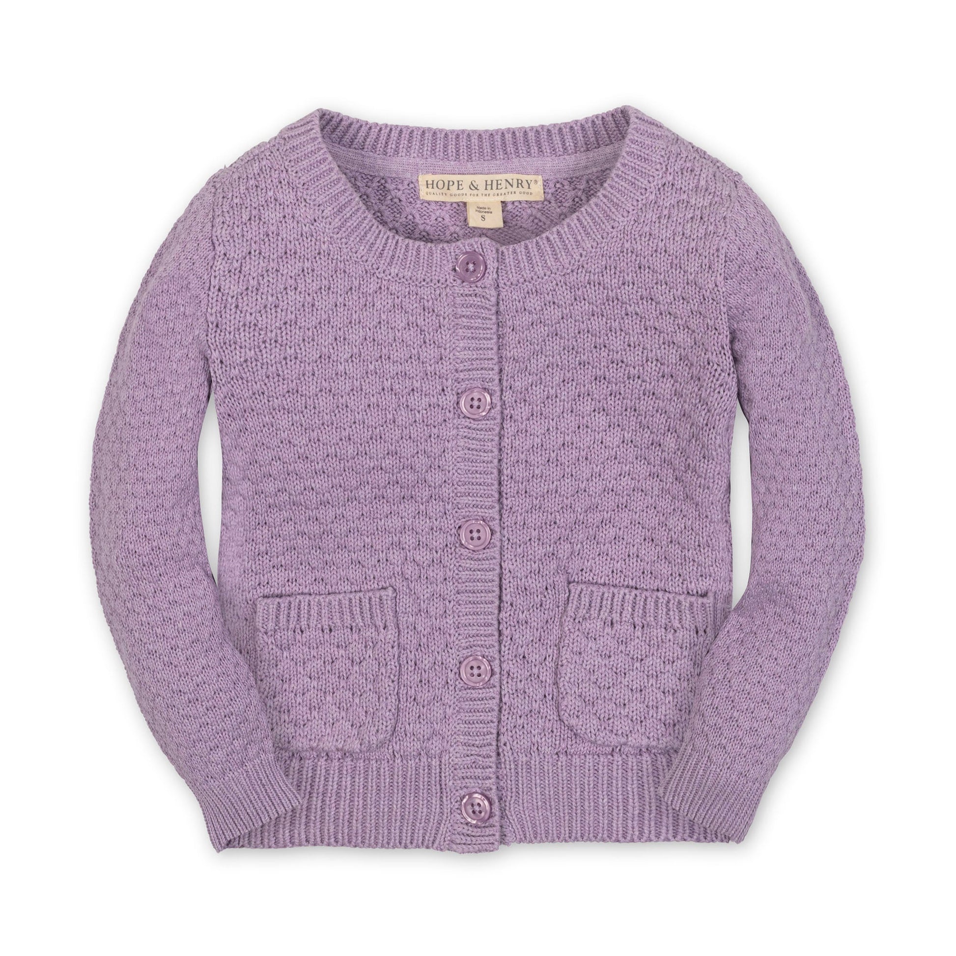 This classic girls lavender cardigan in soft organic cotton feels oh-so-special thanks to a beautiful allover textured stitch. Features a button front closure and front patch pockets.