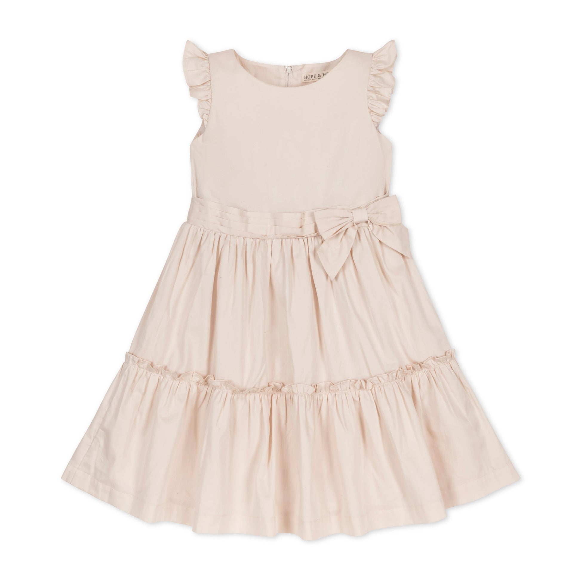 This festive girls party dress in ecru features feminine flutter sleeves, a tiered twirly skirt, waist sash with bow, and a zipper down the center back for easy dressing.