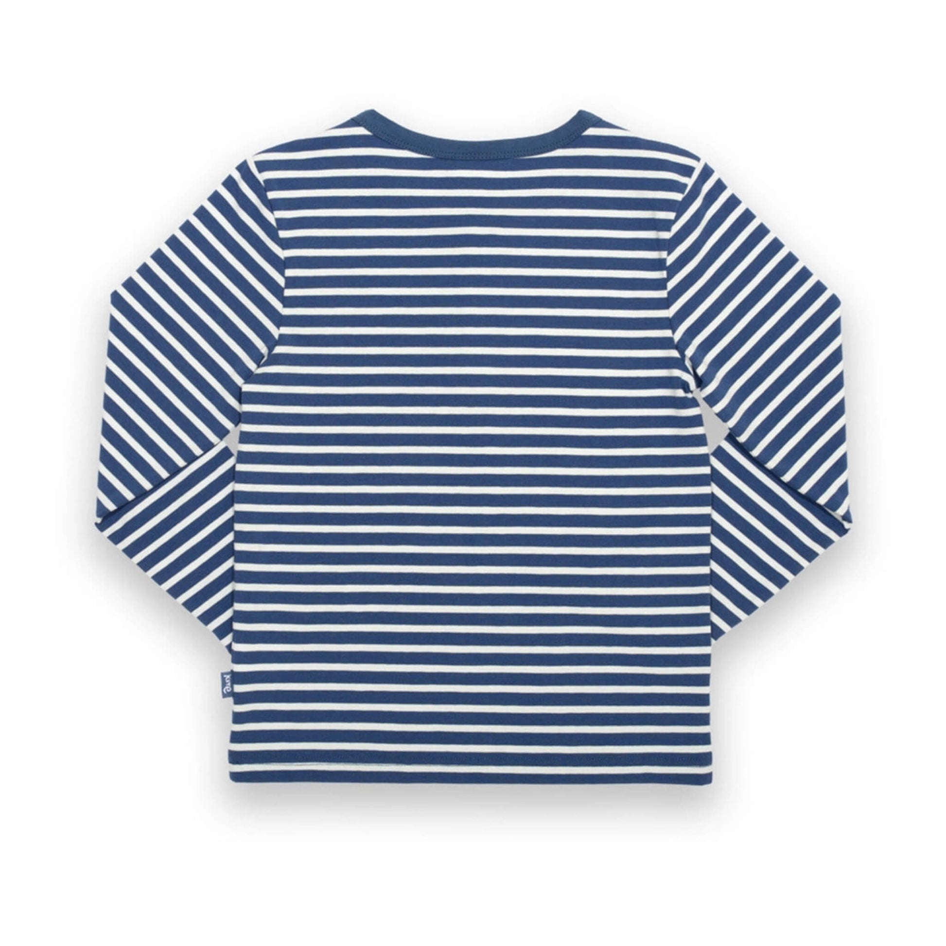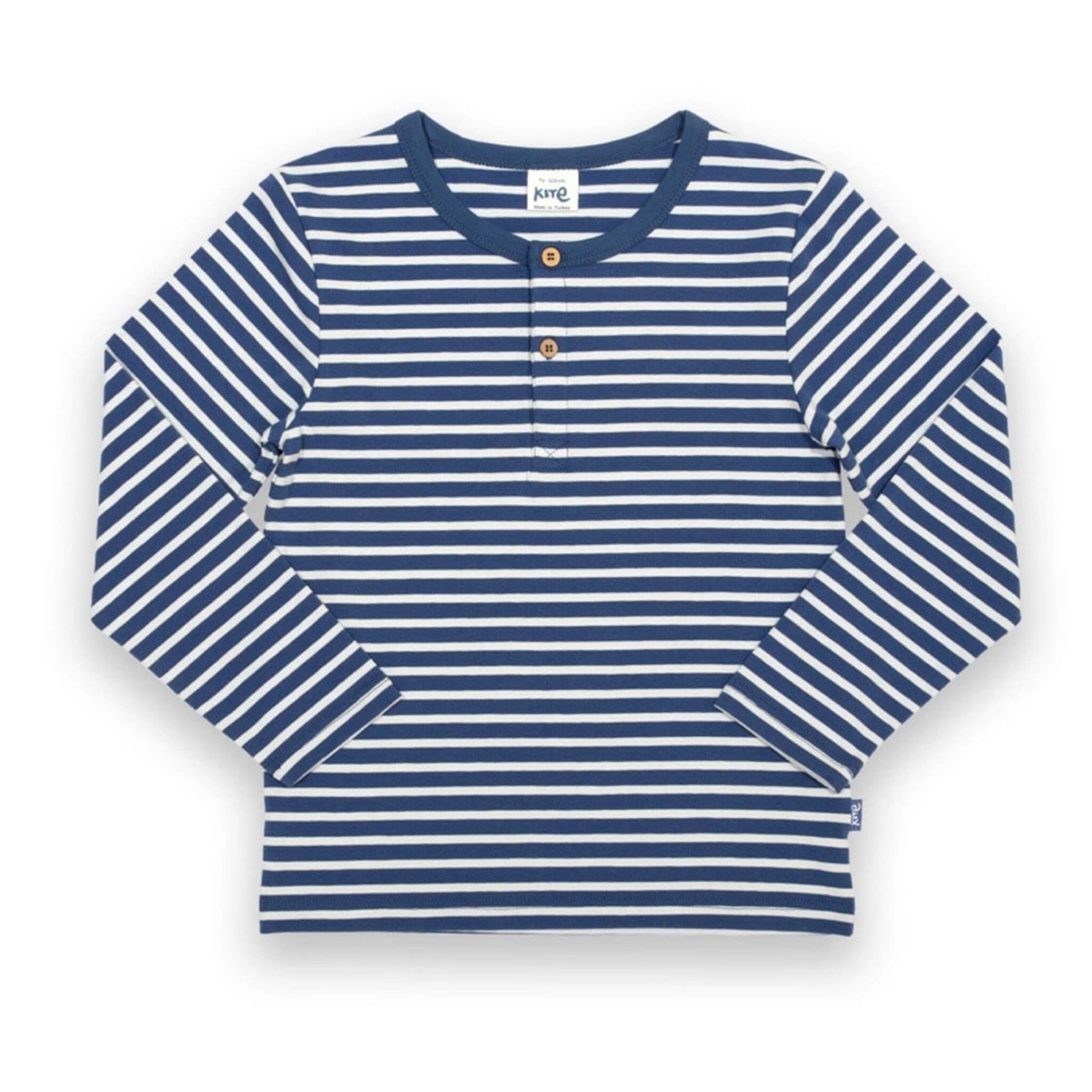 In a versatile navy blue and cream yarn dyed stripe, this organic toddler and kid boys henley shirt is perfect for all seasons. The coconut button-neck opening gives this long-sleeved top a classic vibe.