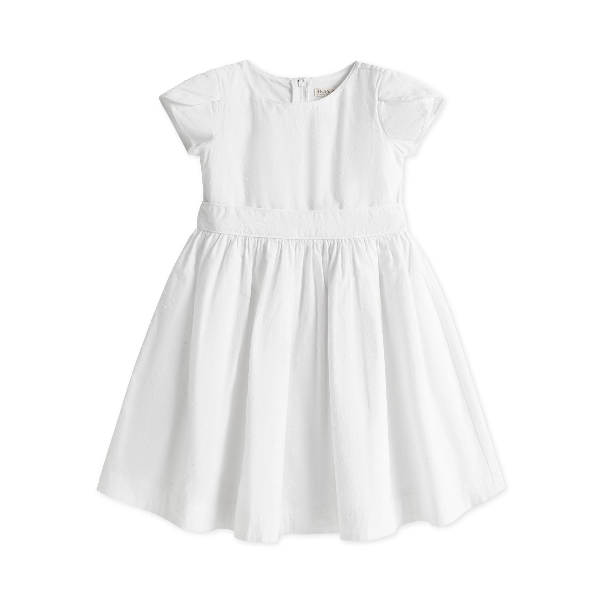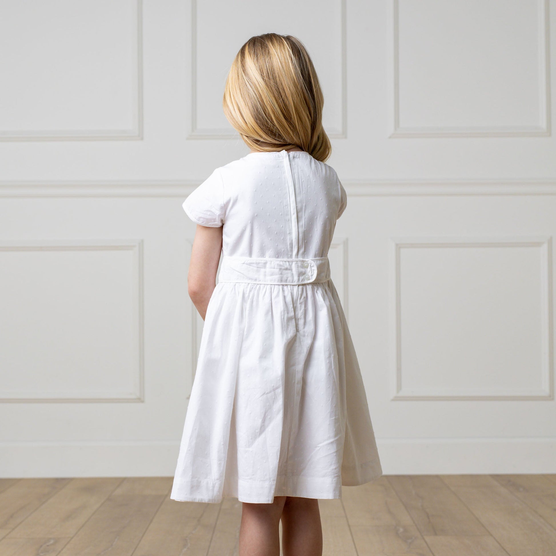 Pretty tulip sleeves are the special detail on this beautiful girls white dress crafted from soft organic cotton swiss dot. Features a flattering fit and flare silhouette, piping at the trim, and a waist sash with button back closure. Fully lined in organic cotton with a zipper at the center back.