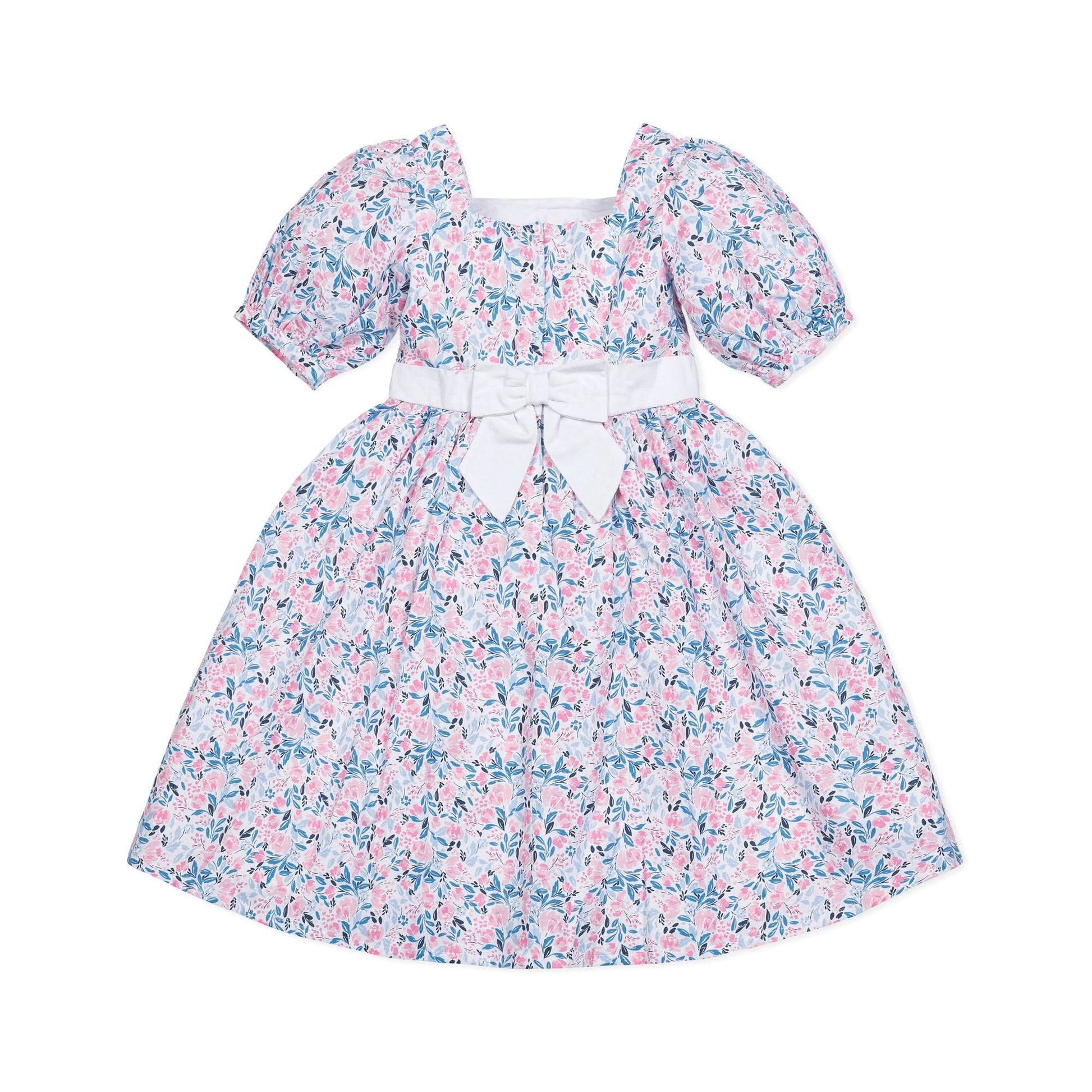 This gorgeous girl's puff sleeve party dress in soft organic cotton has all the incredible details that make it perfect for everything from dinner with the family to twirling on a dance floor. Features beautiful puff sleeves, waist sash with bow, and a button closure at the center back. A showstopper for spring time!