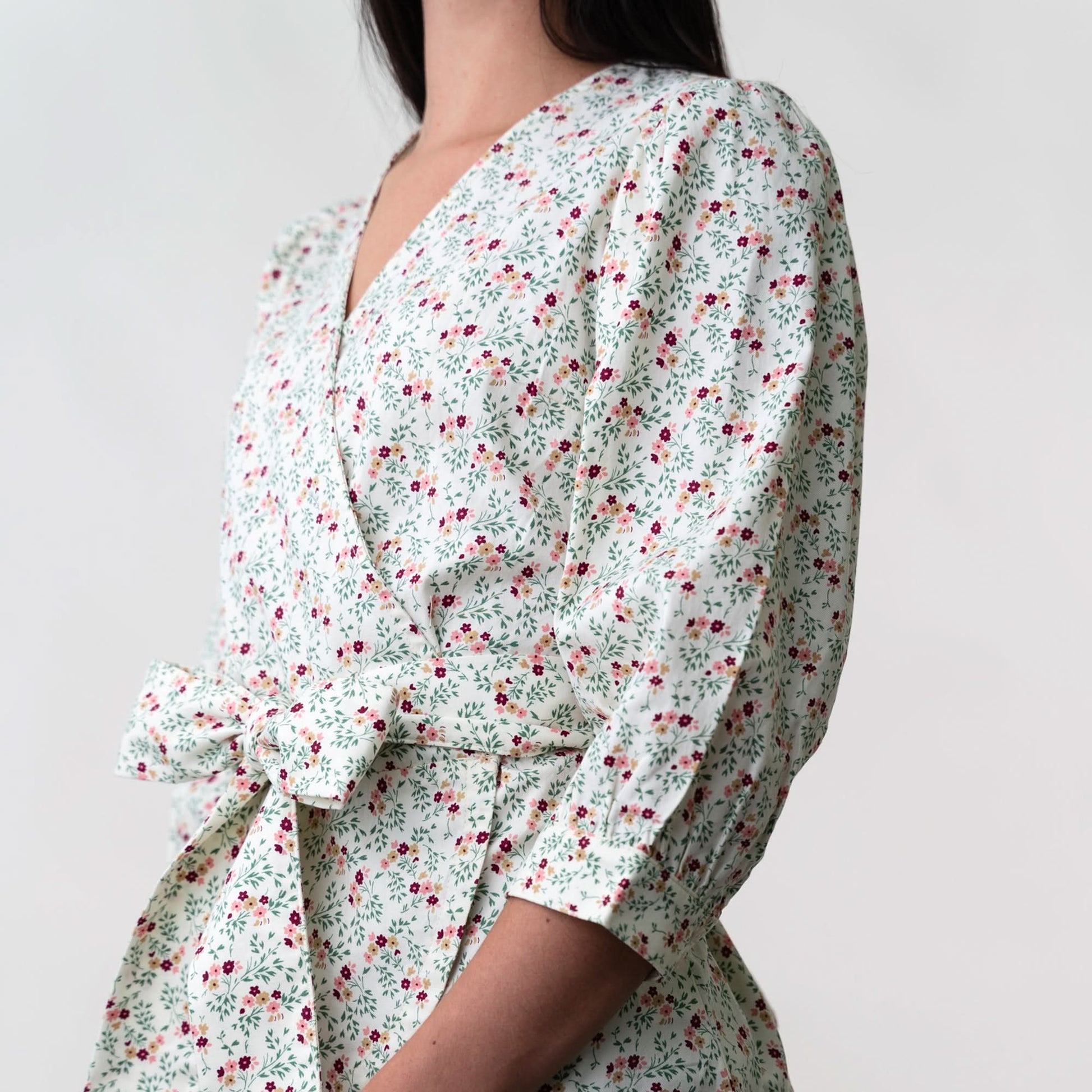 This flattering women's wrap top combines a pretty sash with crisp cuffed sleeves for a beautiful feminine look. Features a gently curved hem, removable sash, full sleeves, hidden closures, and elastic at the back waist for the perfect fit.