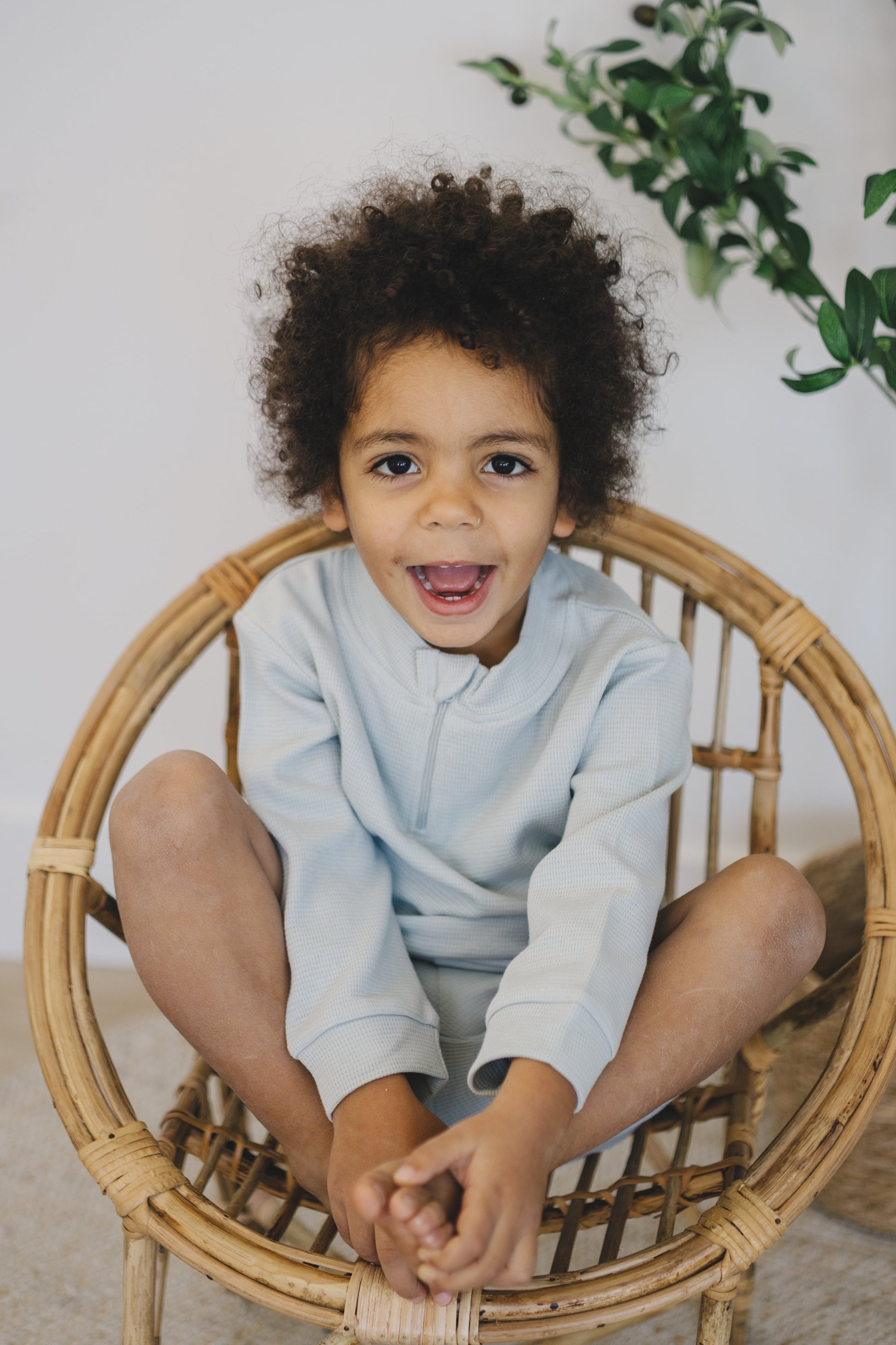 This quarter zip organic waffle knit top in seafoam green is perfect for your baby or toddler to lounge in and play. Pair with waffle knit pants available separately to complete a stylish look.