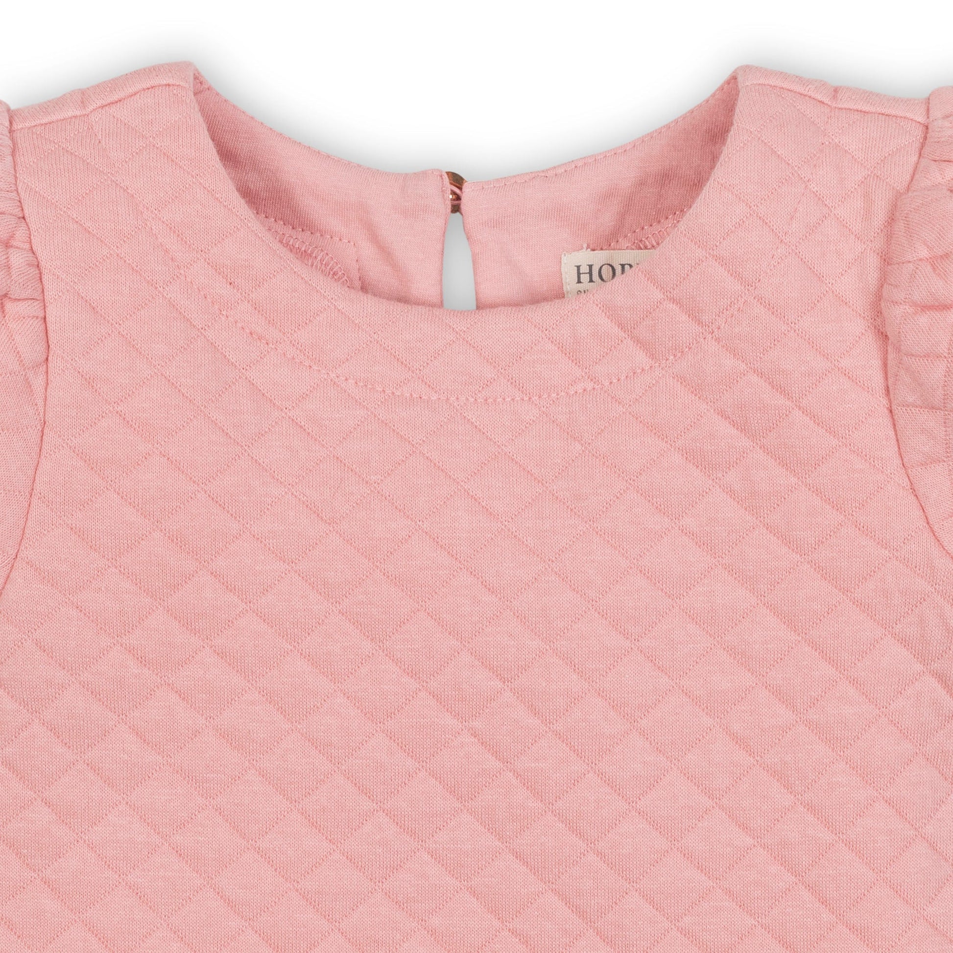 It's all about a beautiful silhouette and subtle texture in this gorgeous girls quilted drop waist dress in rose pink. The pretty peasant sleeves and gold button closure down the center back lend a sophisticated feeling, while the organic cotton blend knit fabric is so soft and comfortable to wear.