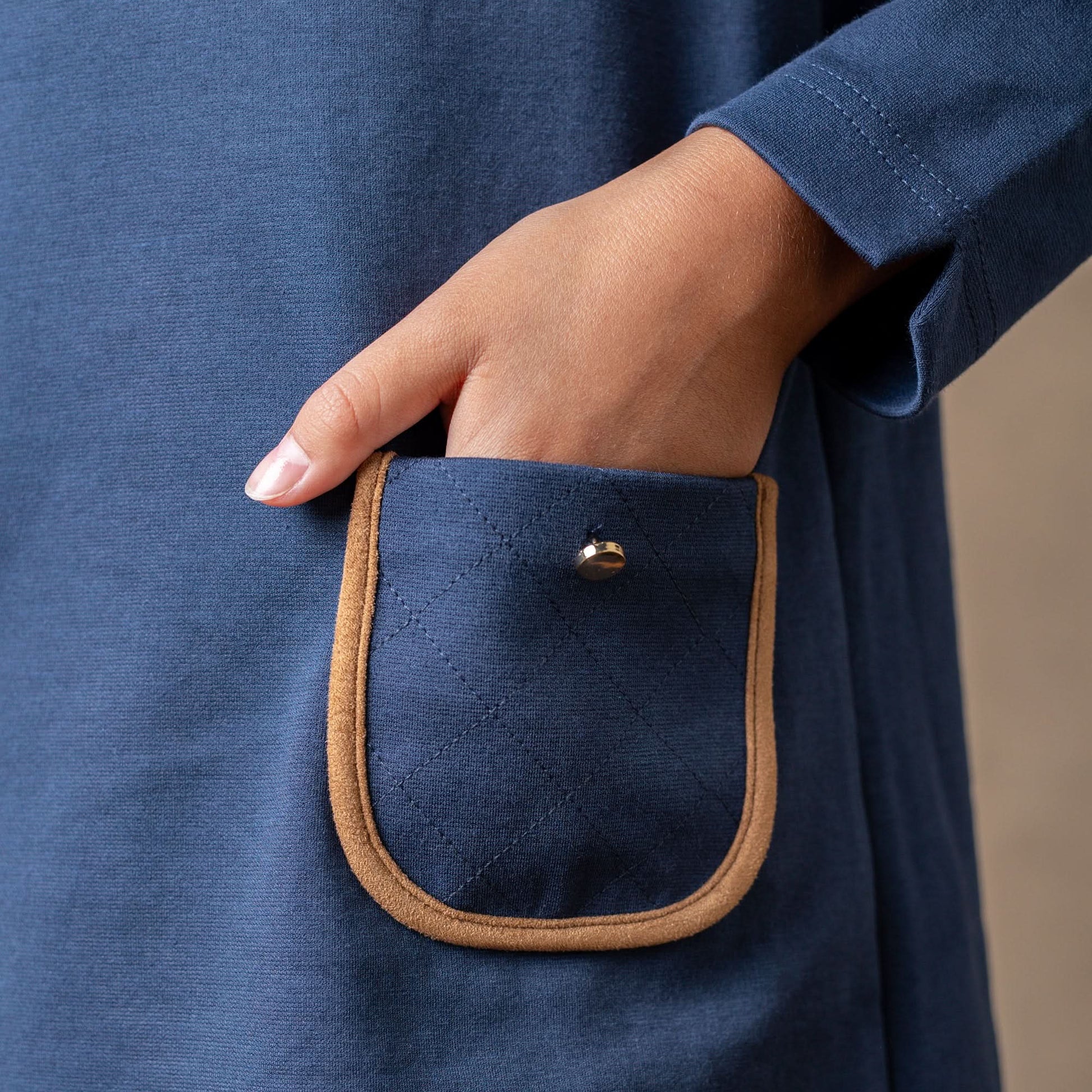 This girls quilted ponte riding dress in navy combines comfort with style. The thick knit fabric has plenty of stretch and the suede details at the elbows and pockets add an equestrian touch. Gold buttons at the front add just the right amount of sparkle.