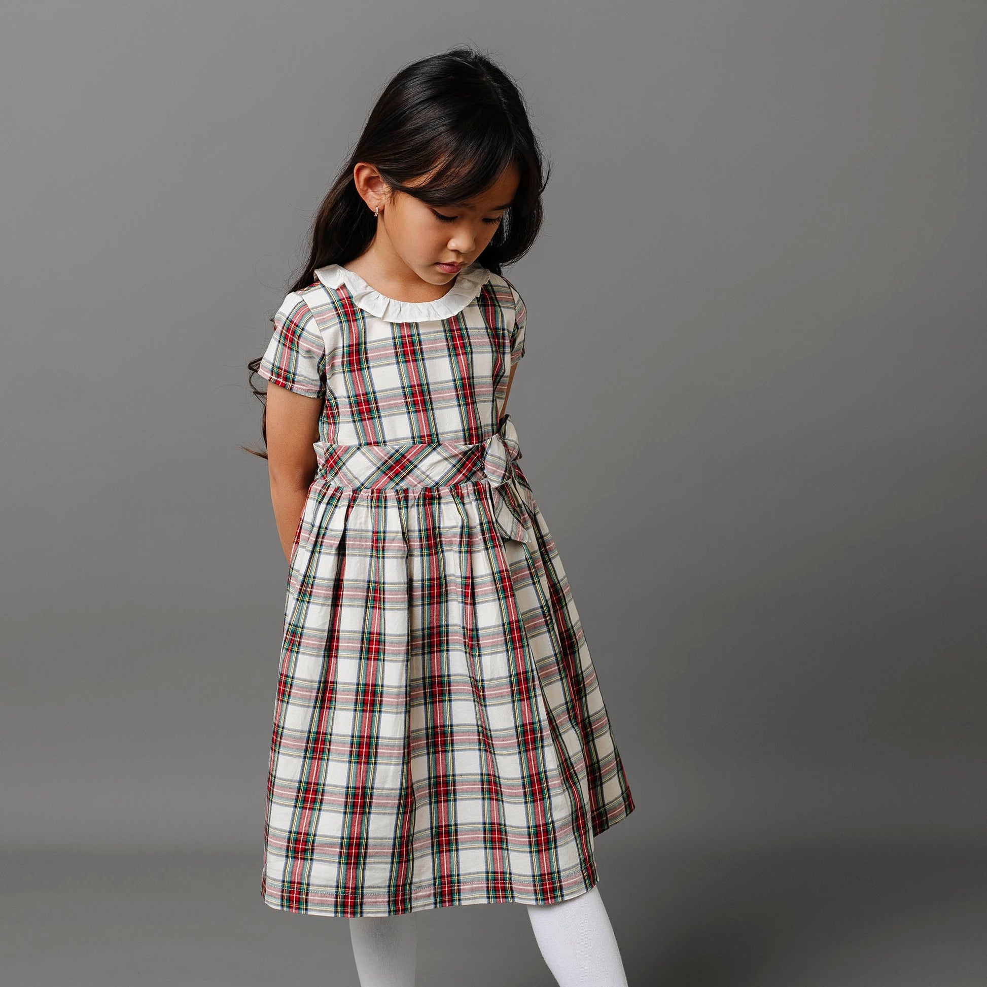 Girls Ruffle Collar Organic Party Dress - Ivory Tartan
