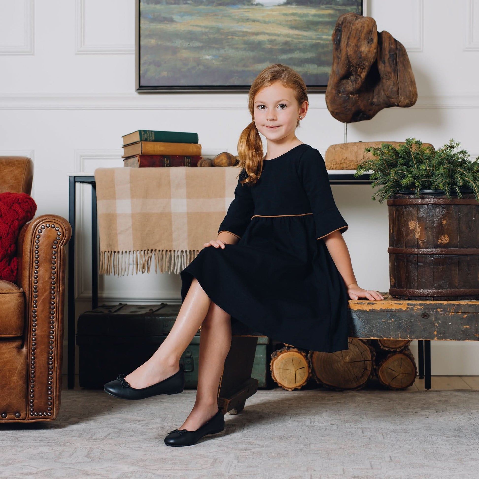 This darling girl's black party dress combines the comfort of luxurious organic cotton ponte knit with classic tailored details. Features feminine ruffle edge sleeves, faux suede piping, and a gold button closure at the center back for just the right amount of sparkle.