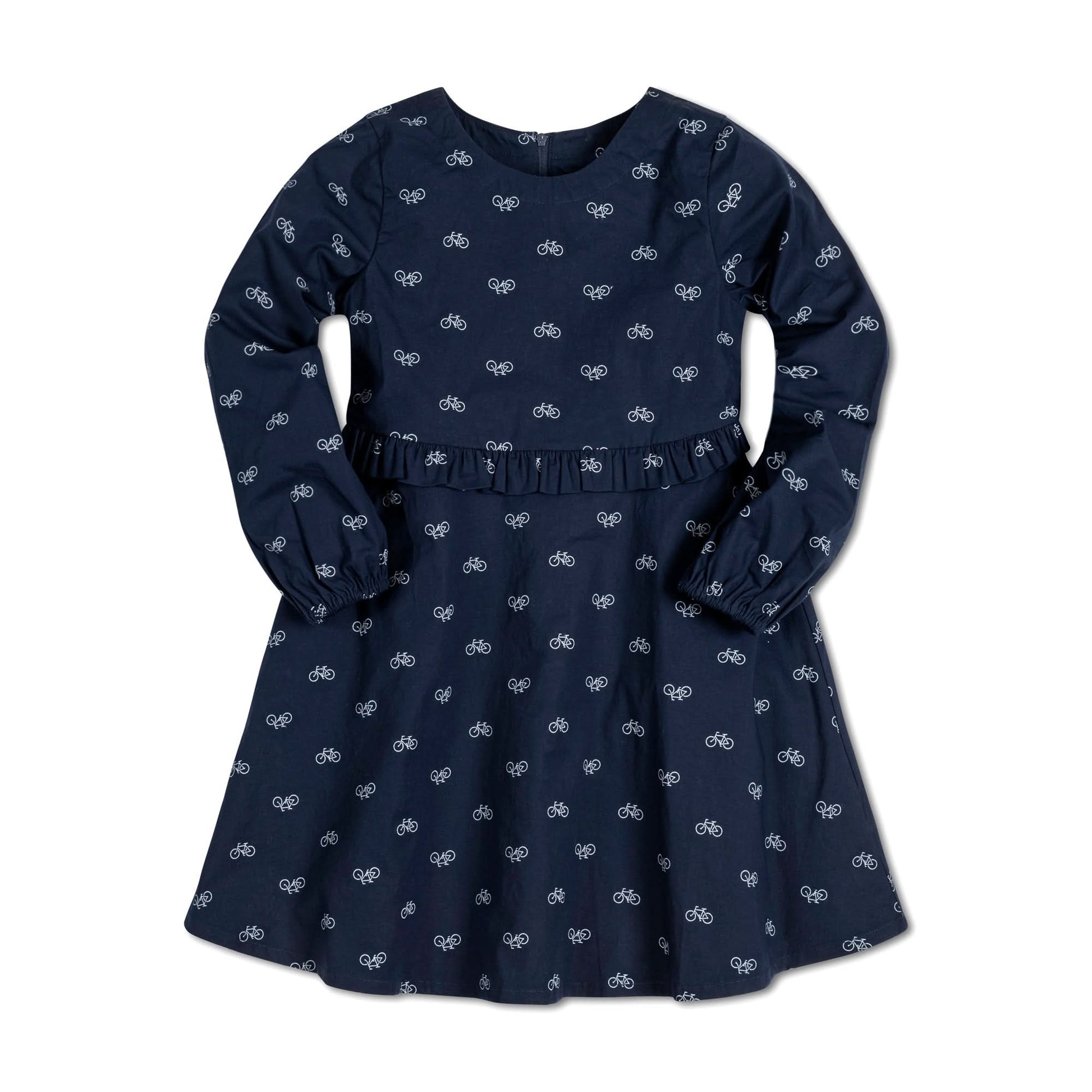 A beautiful and feminine silhouette in soft organic cotton brings charm and sophistication to this long sleeve dress. Cut from a fun bicycle print twill fabric, this dress features gently belled sleeves, a small ruffle detail at the waist, and a zipper closure down the center back for easy dressing.