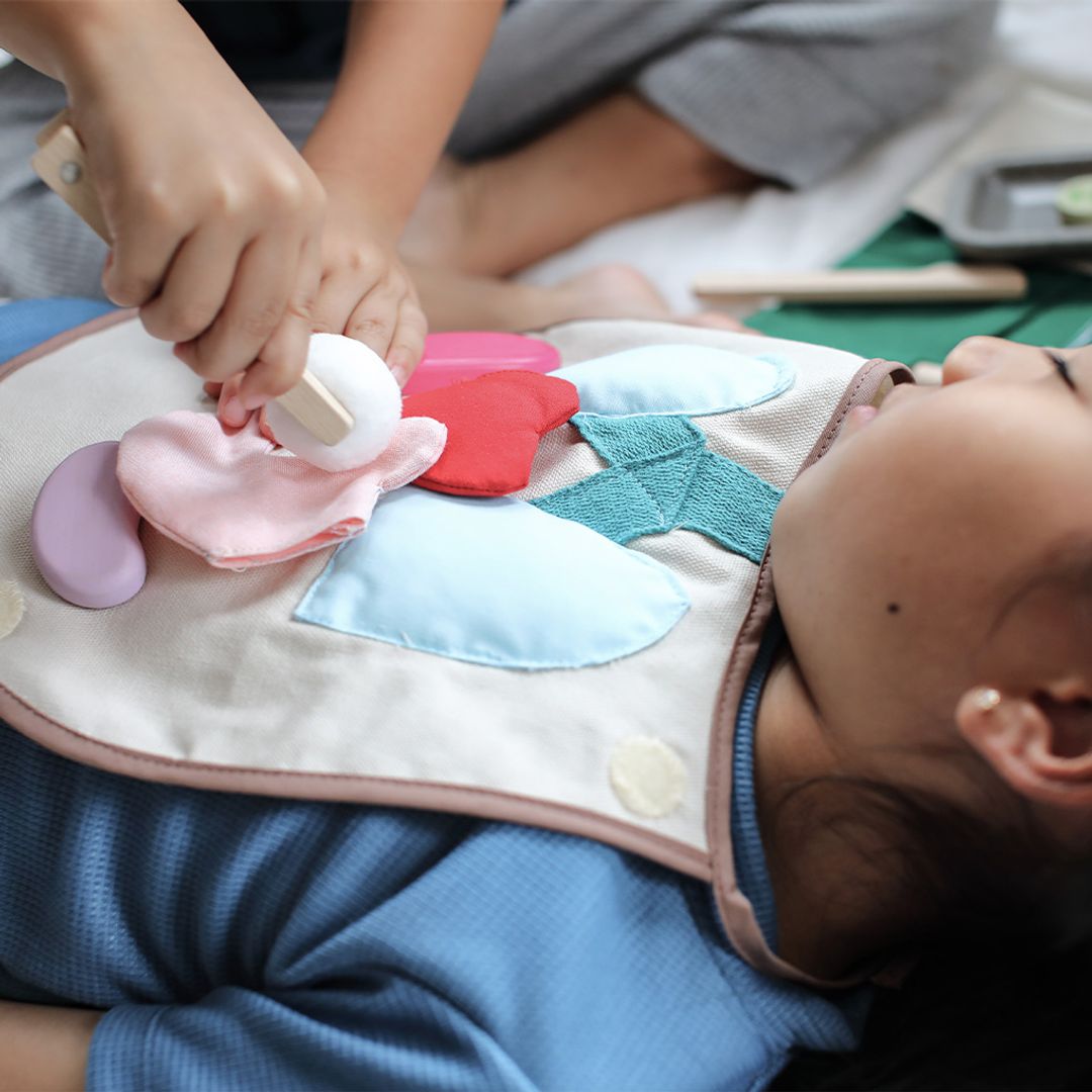 Role play as a surgeon and learn about the human body with the Surgeon Play Set! This playset includes a fabric piece labeled with different organs (the bronchus, lungs, heart with a beep button, stomach with a piece of food inside, liver and kidneys) that can be used for realistic pretend-play with dolls and stuffed friends.