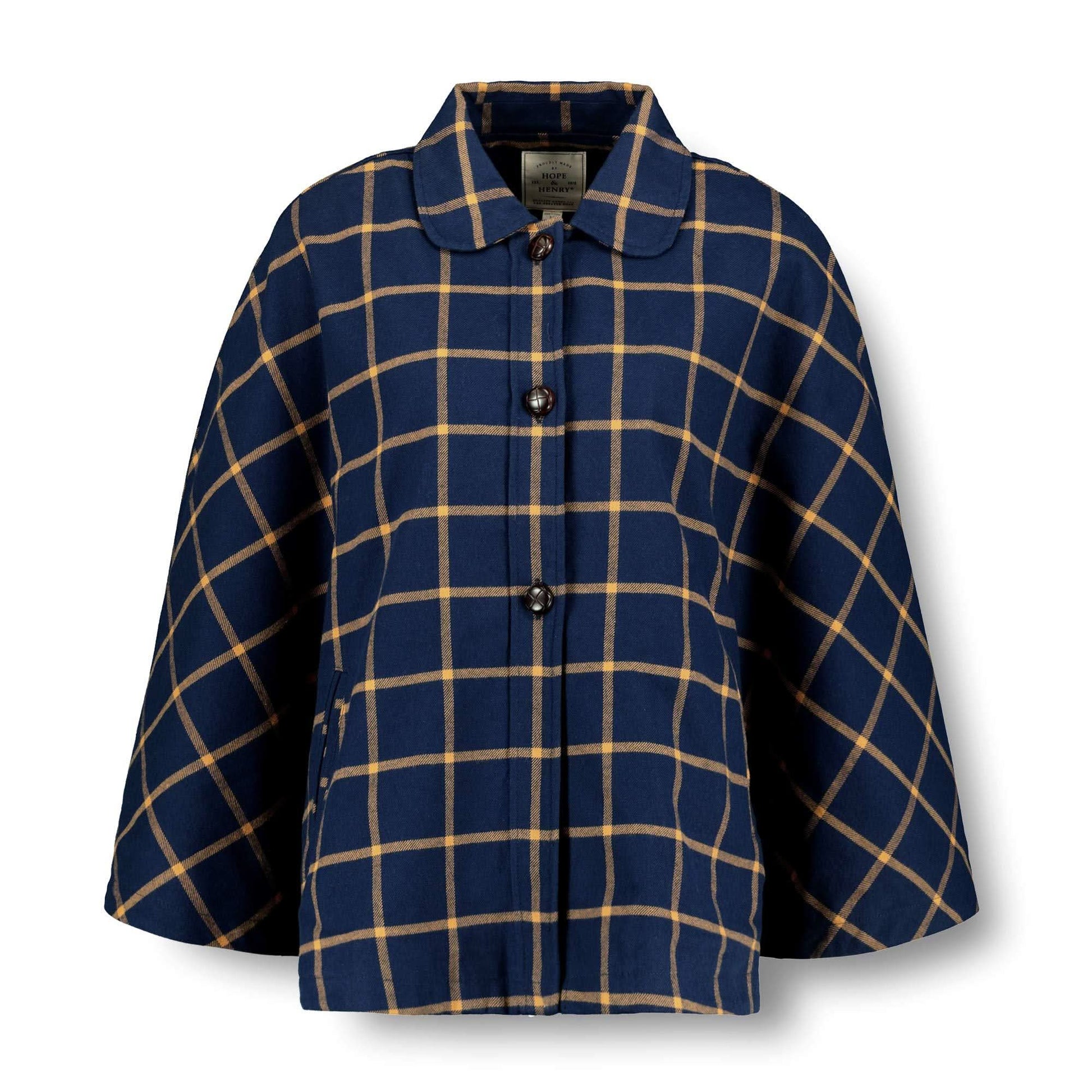 This charming women's cape is an effortless fall silhouette that will layer easily over a beautiful sweater or top. Crafted from heavy weight brushed cotton flannel in a navy windowpane fabric that feels so soft against the skin. Features a rounded collar, faux leather button front, front welt pockets, and fully lined in fleece for extra warmth.